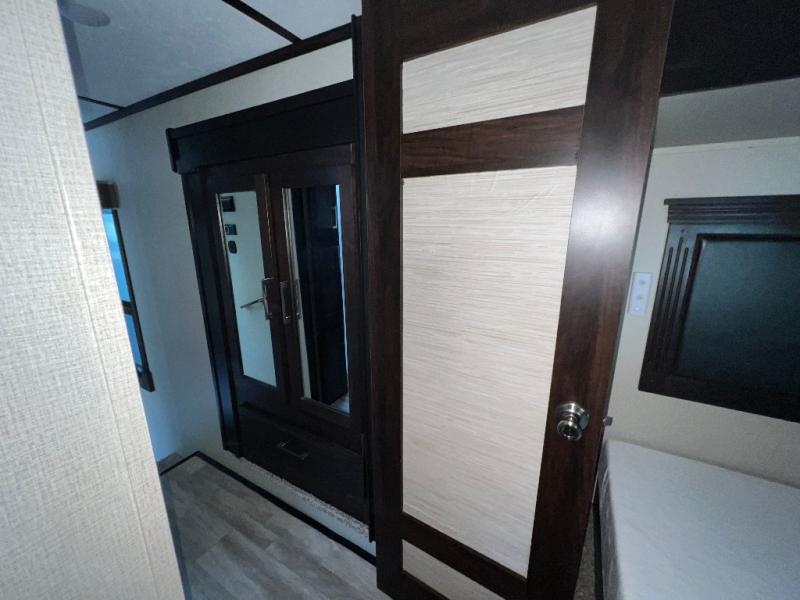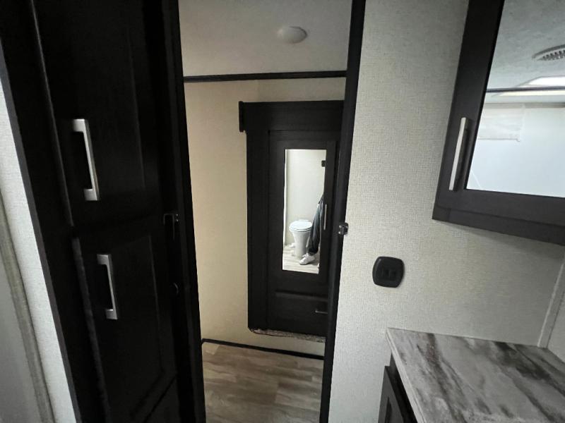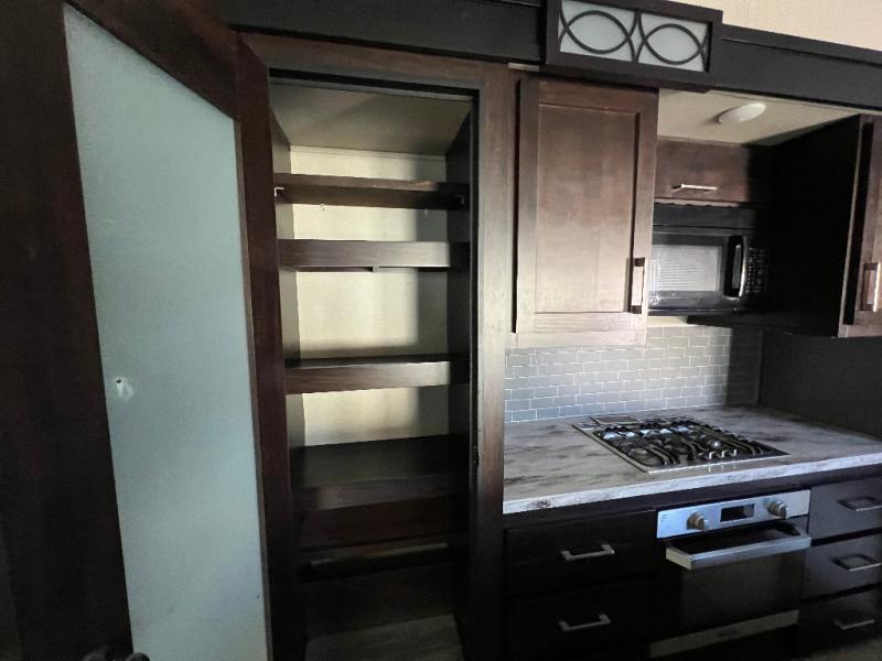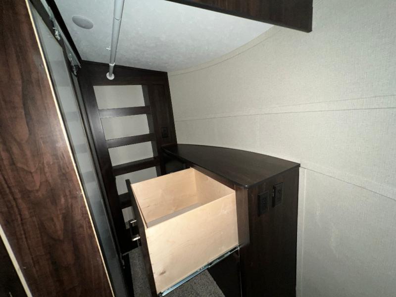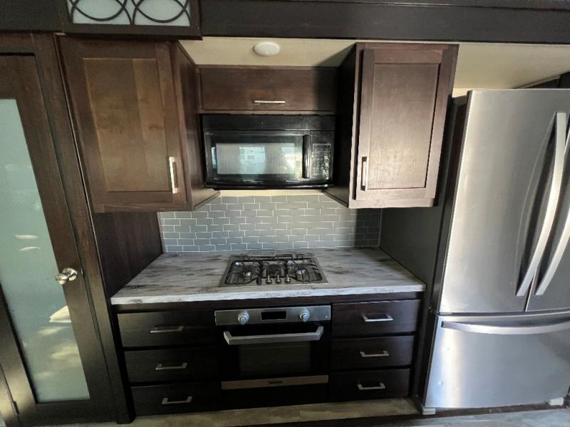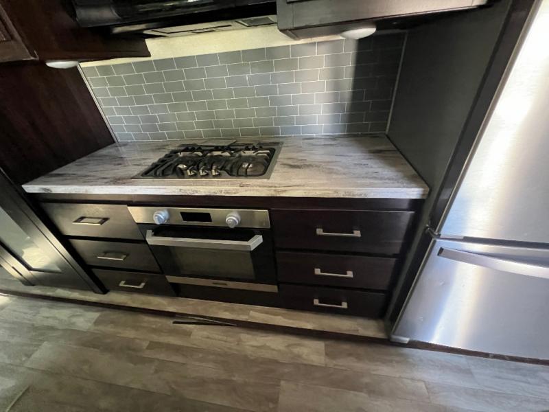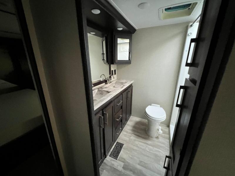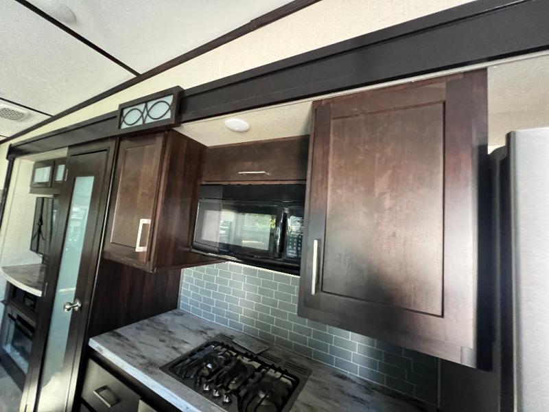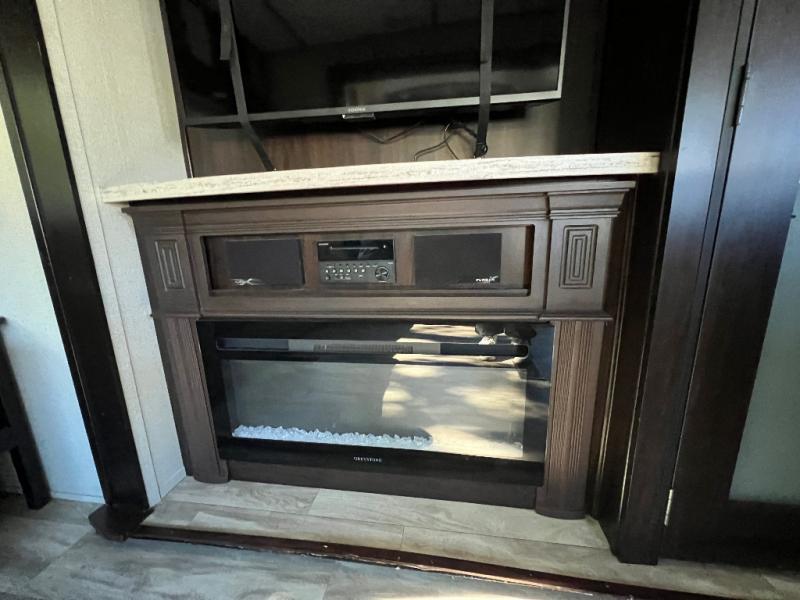 Comfort, luxury, and relaxation come to mind when entering this Sanibel fifth wheel 3650. Inside you will appreciate the dual sinks in the heated bathroom allowing more space for everyone to get ready for the day, including the 48" shower with "Stor Mor" shower caddy. When it's time to cook, the kitchen island provides plenty of counter space, a stainless steel sink with an extra deep bowl, and a 12 cu. ft. side by side refrigerator allowing you to stock up on all your favorite cold items. There is plenty of residential style seating, a king size I-Rest mattress, and a washer/dryer prepped space, plus more!