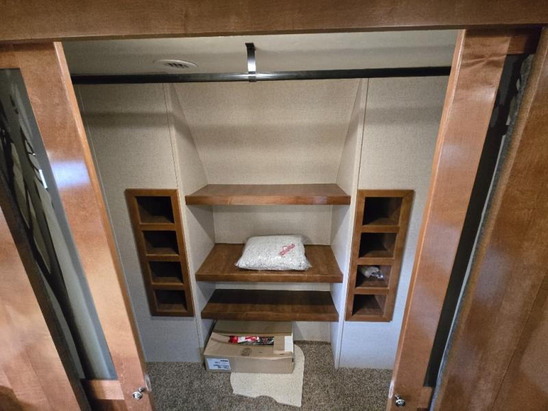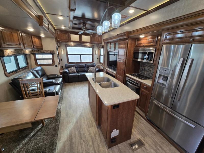 Come make this luxury fifth wheel your home away from home while you camp at your favorite campground! Model 3401RL features triple slide outs, a rear living area with a sofa along the rear wall and a set of theater seats. Meal prep is a breeze in this residential kitchen. You will love all of the storage space with the residential refrigerator and large pantry. The kitchen island features extra counter space as well as a double sink. Head up the stairs and you will find that the bathroom is to your left, and the front bedroom is past the bathroom. Here you will find a king bed, plenty of storage with a chest, a large wardrobe, plus there is a spot for an optional washer and dryer, and more!