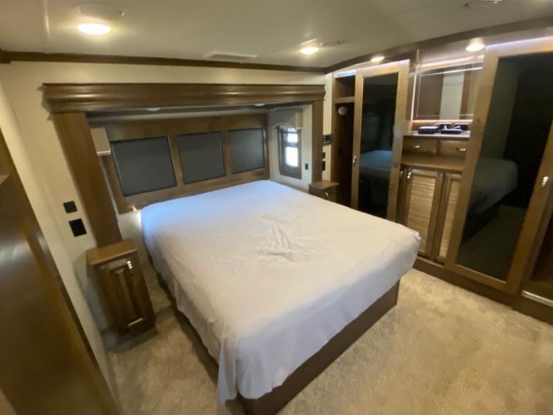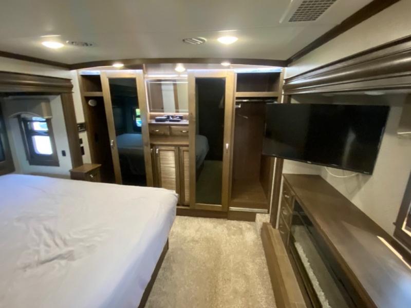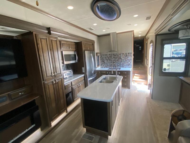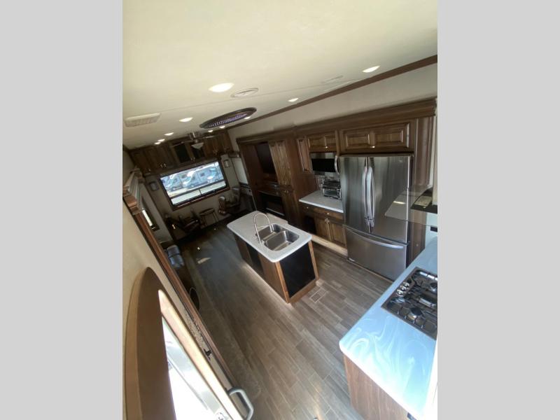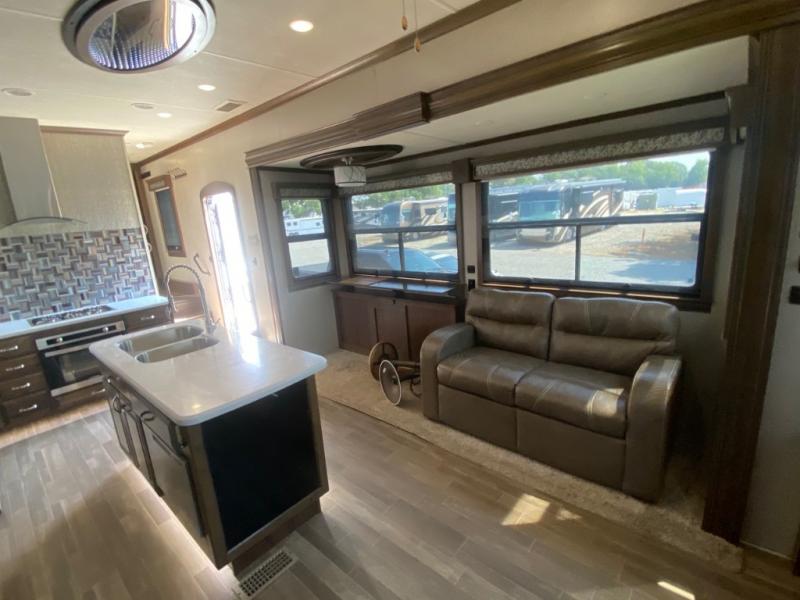 When you are ready to leave the cares of your busy life and enjoy the pleasures of camping, then do so with this quad slide out RiverStone 37IK fifth wheel. In the combined kitchen and living area you can sit and visit at the 80" sofa, the two recliners or at the pull-out dinette. When you are ready to watch a little TV then come do so at the 60" LED Smart TV or enjoy a fire in the fireplace. Meal clean up is a breeze with the island where you will find a double sink plus there is a dishwasher! In the front bedroom there is a king bed plus a 43" TV and more!
