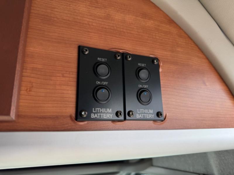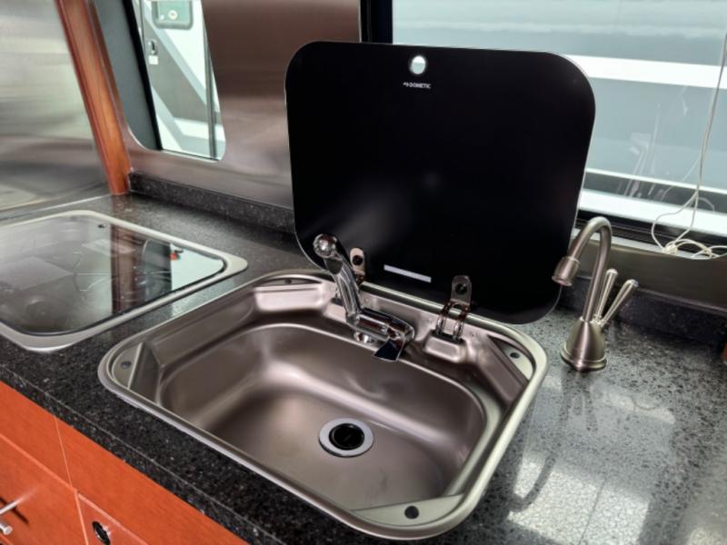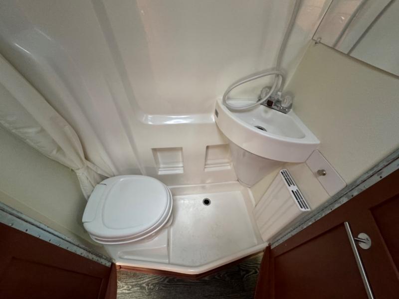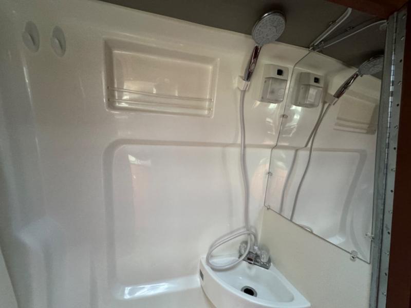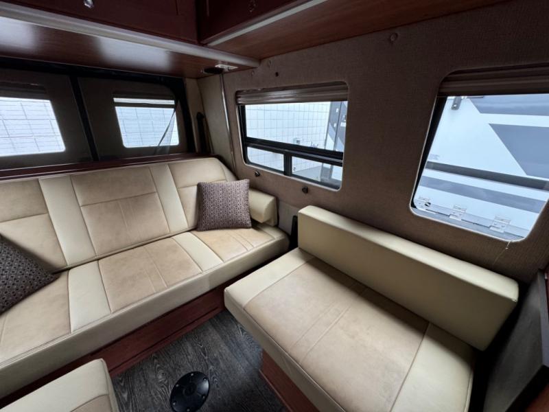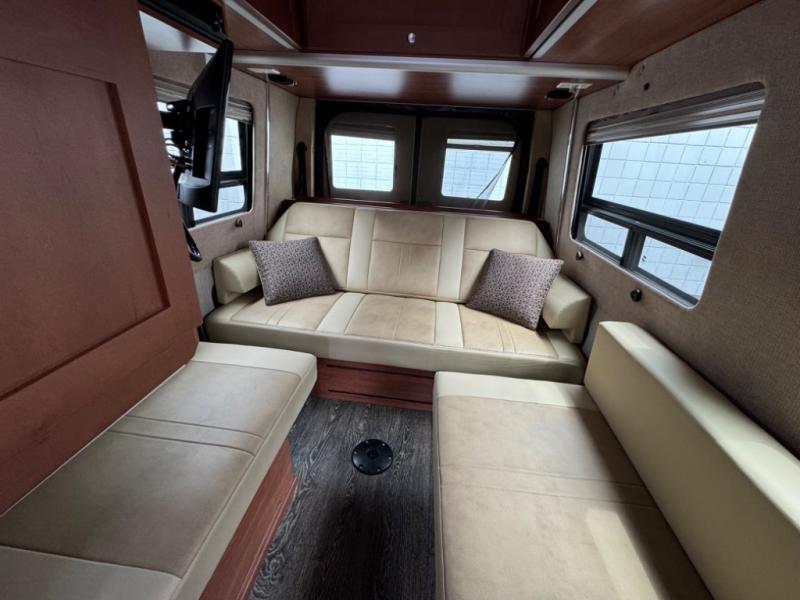 The front offers three comfortable swivel captain's chairs with a table. The passenger side chairs can be converted to additional sleeping. A toilet, sink and shower are enclosed along the passenger side. Continuing to the back there is a wardrobe.