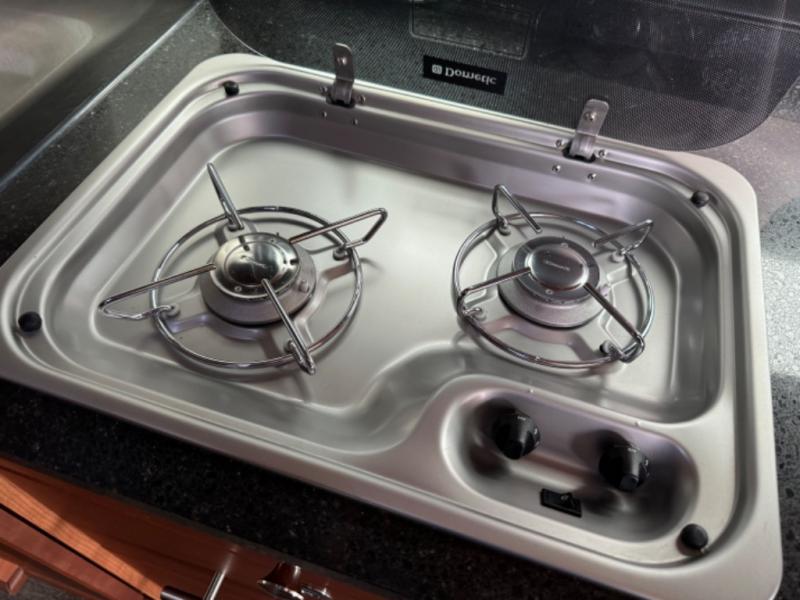On the opposite side, you will find a two burner stove top as well as a sink, refrigerator and microwave with plenty of storage and more!