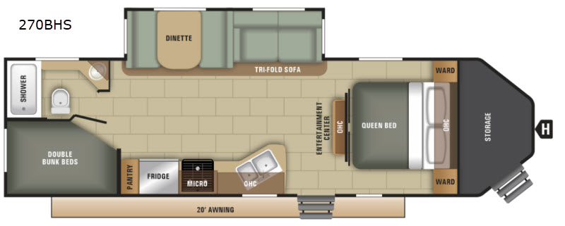 For your next family vacation choose this single slide out Starcraft GPS 270BHS travel trailer. This model is ideal for the outdoorsy family who likes to camp but also enjoys spending time fishing or kayaking. In the front Starcraft Storage Locker you can easily store all of your outdoor camping gear. At night come back to the comforts of your trailer. You will find plenty of sleeping space with the front bedroom, rear set of double bunk beds, and you can even convert the dinette and tri-fold sofa into additional sleeping spots. The 20' awning provides plenty of shade during the day from the sun and is a great area to sit and reminisce about your day of outdoor fun!
