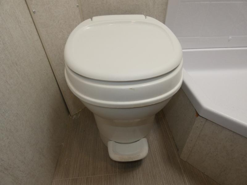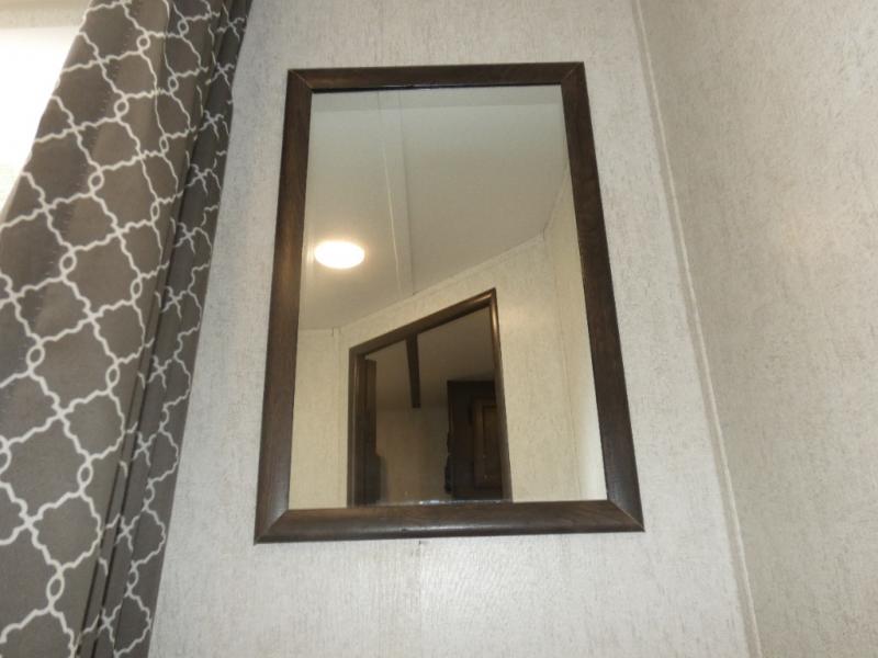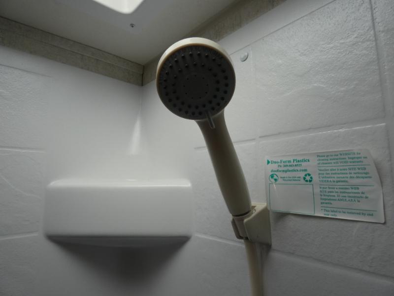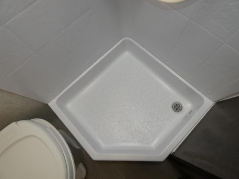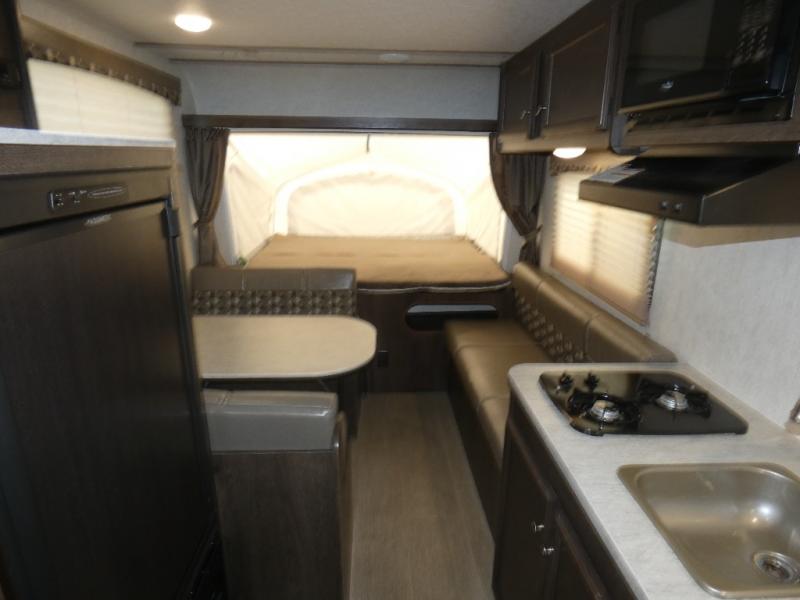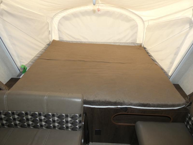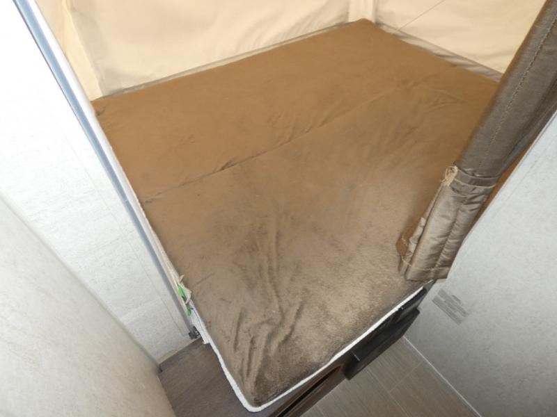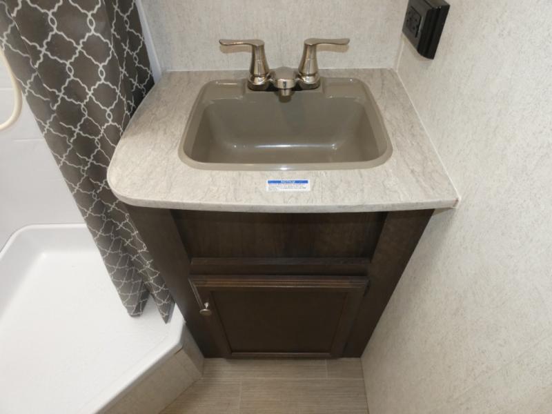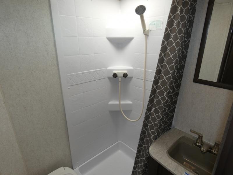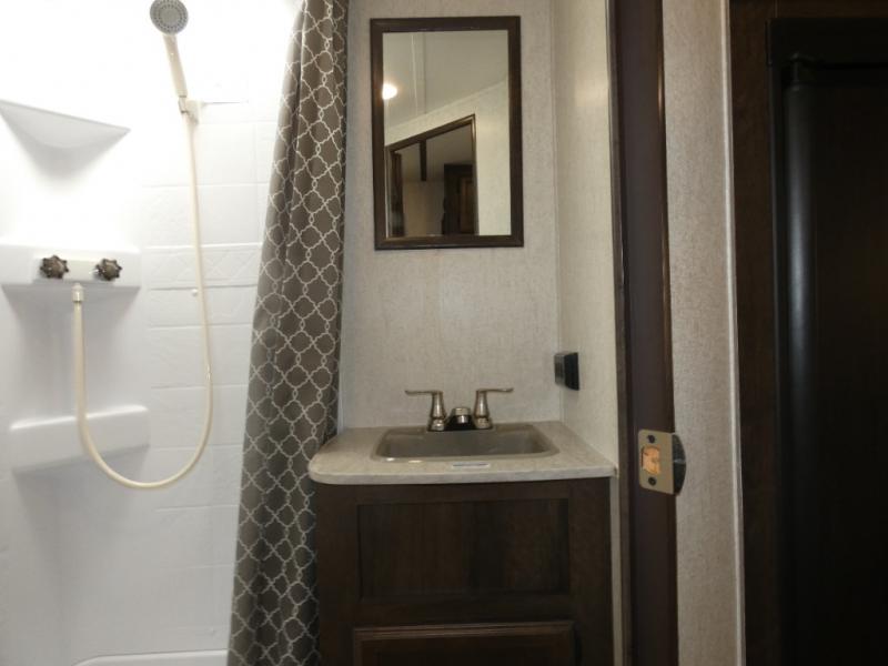 Step inside and notice the convenient location of the bathroom straight ahead. Inside find an angled shower, toilet, and vanity with sink. There is also an overhead shelf that stretches the entire width of the unit across the back and front above each tent end bed's entry.