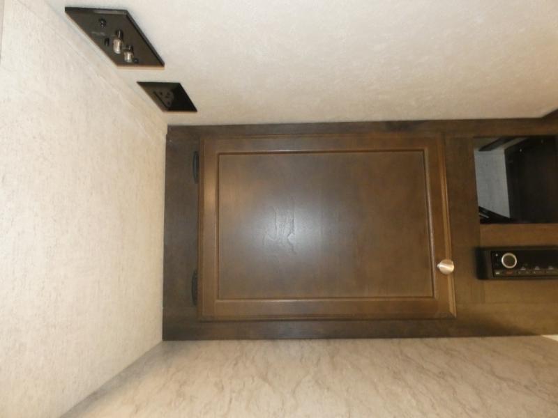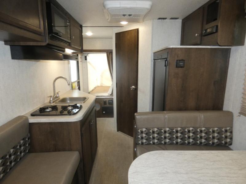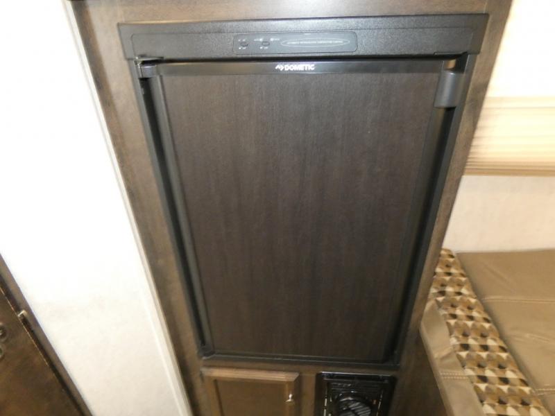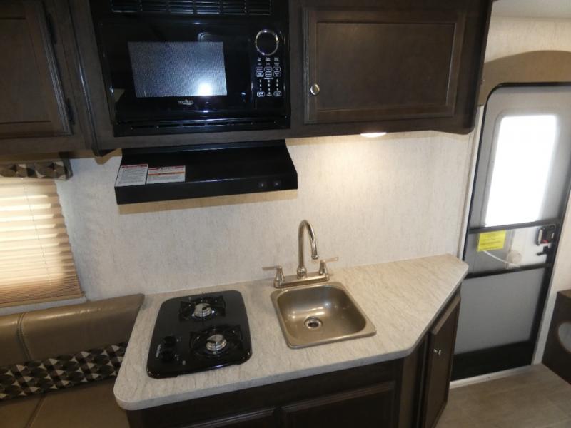 To the right of the entry door you will find the kitchen area where you can easily prepare food for yourself and your family. There is a counter area with a single bowl sink, a two burner cook-top with overhead microwave oven, and a refrigerator opposite for all of your cooking needs.
