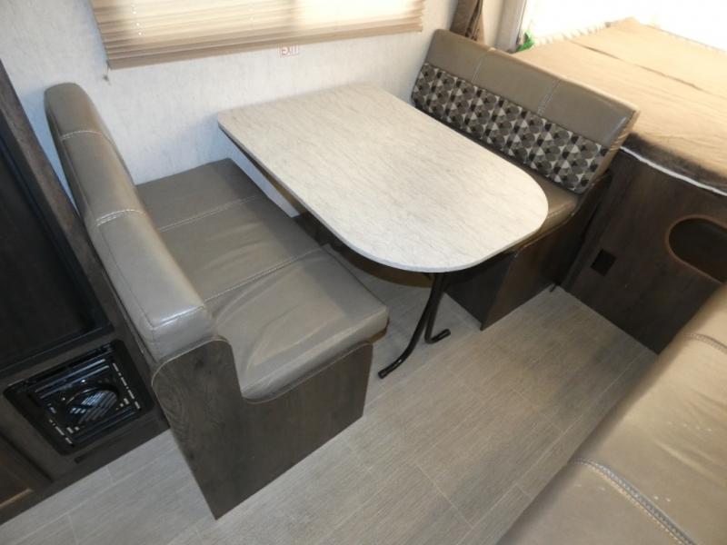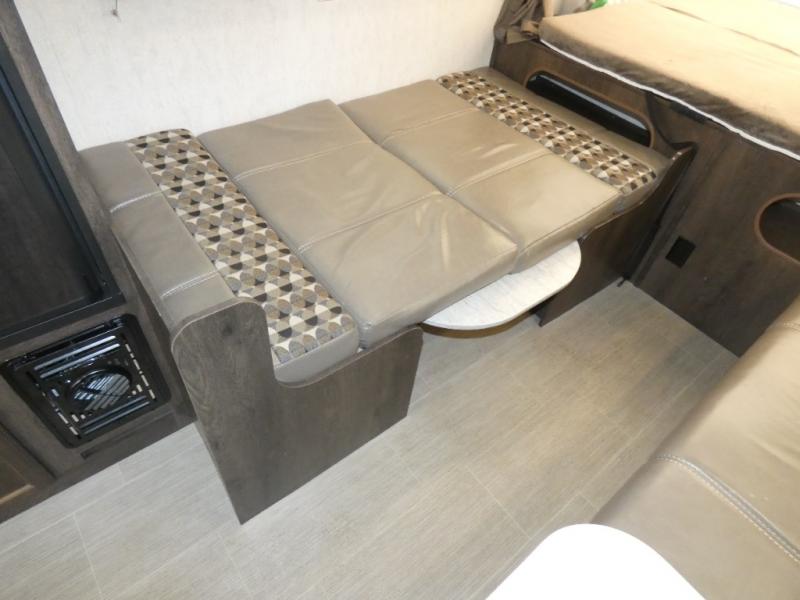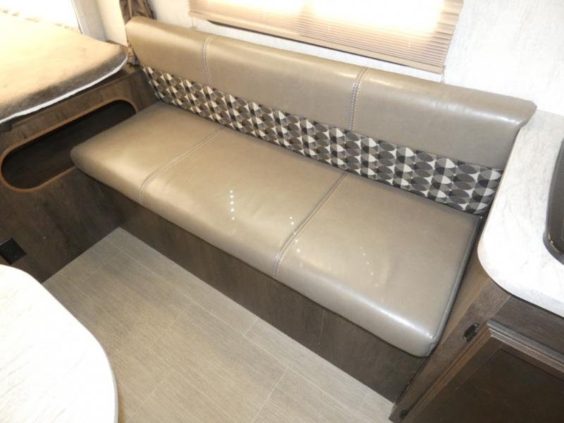 When it is time to sit down and enjoy the meal prepared you will love the booth dinette along the road side up front. Opposite there is more seating on a sofa, plus some nice overheads storage is located here as well.
