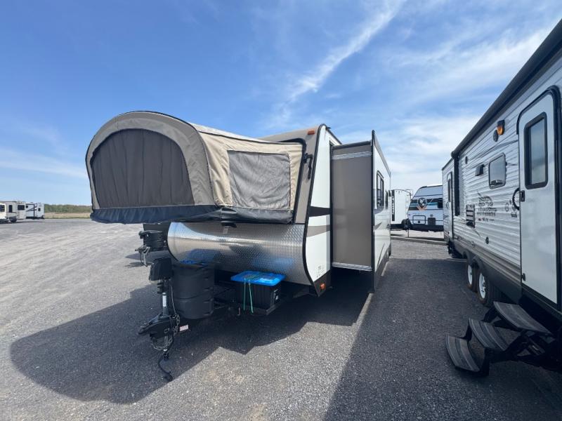 The 2018 Starcraft Travel Star 227CIKS is a travel trailer model. It's a hybrid trailer, meaning it has expandable sleeping areas. It includes a slide-out room and a solar roof-mounted addition
