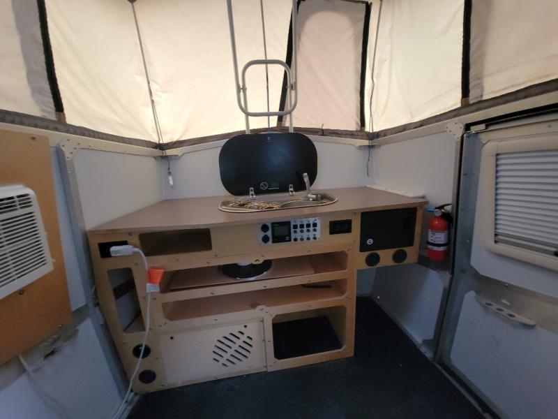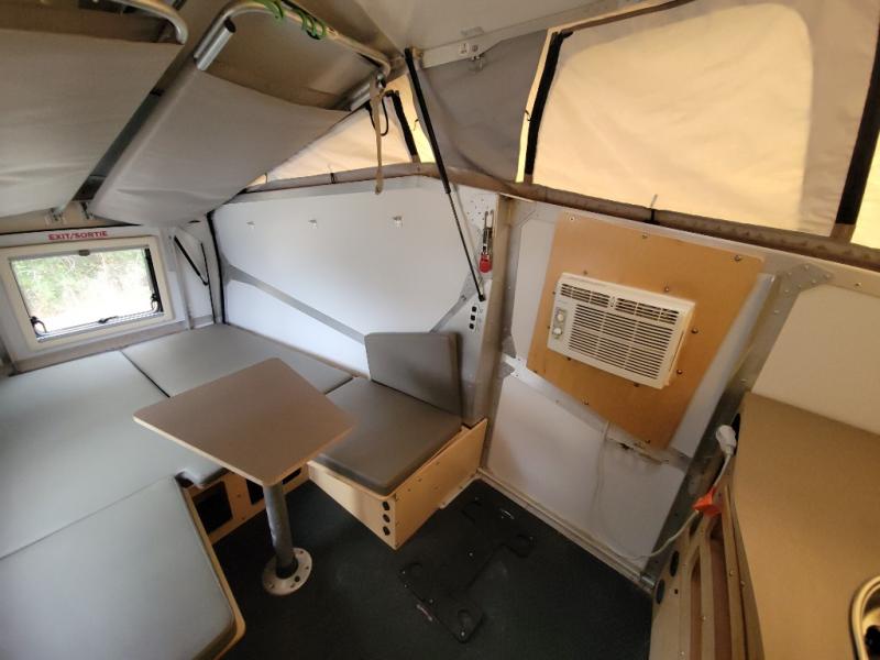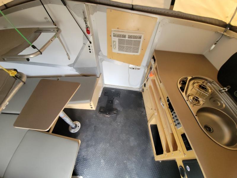 If the rugged outdoors is what you dream about while working, it's time to hit the road in this this Cricket Trek camper trailer by TAXA Outdoors. You may venture off grid or to your favorite campsite with your family and friends, the choice is yours. You can sleep on a queen size bed at night with two pull down bunks for the kiddos once the pop-up roof is set up. You will be amazed at the views from the 32" x 20" picture window while eating dinner at the dining table, and the superior cross ventilation from the four swing windows and five mesh windows. You can wash your dishes in the covered sink, and store them in one of the six cubbies. You may choose to get wash up using the exterior shower with hot and cold water. The roof rack will allow you to take your bikes along with you. It's time to start living your dreams in the great outdoors!