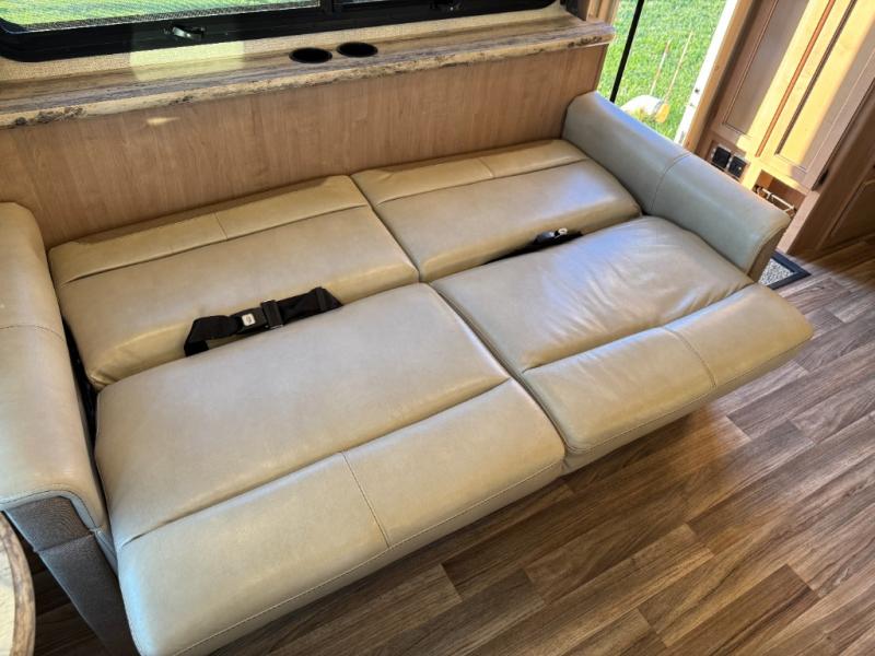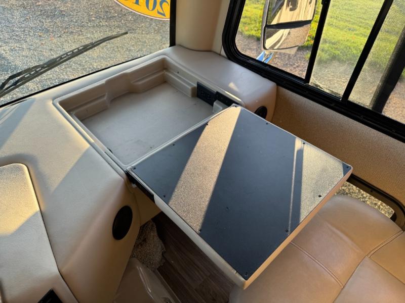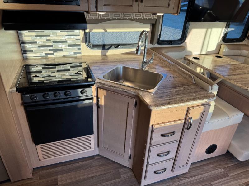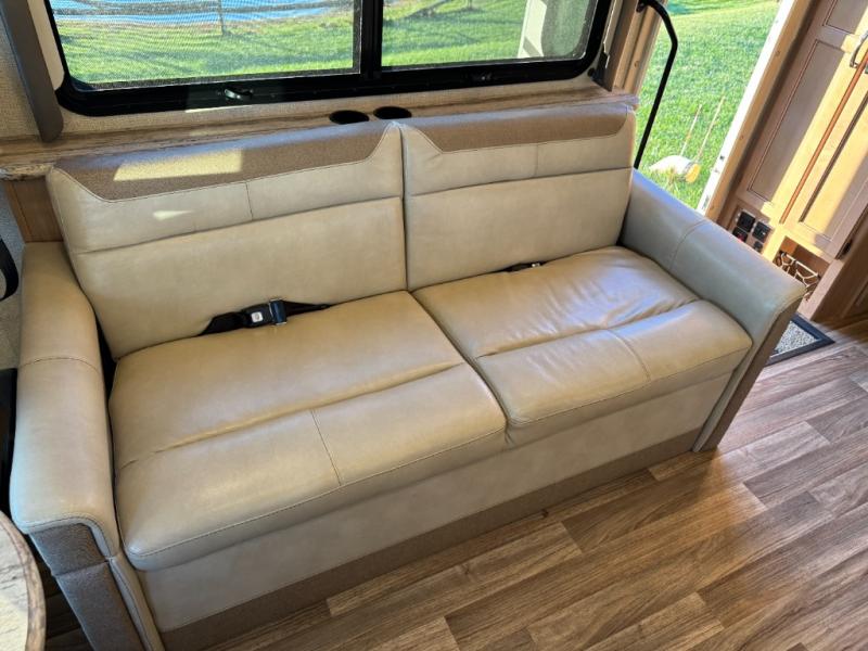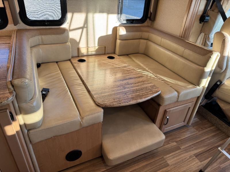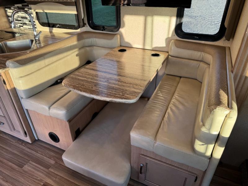 Step inside and find a jack-knife sofa to the right of the entrance. Across from the sofa is a booth dinette for mealtime and more. There is a 40" LED TV above the dinette that can easily be viewed from the sofa opposite. A convenient coffee table is between the driver and passenger seats for additional table space.