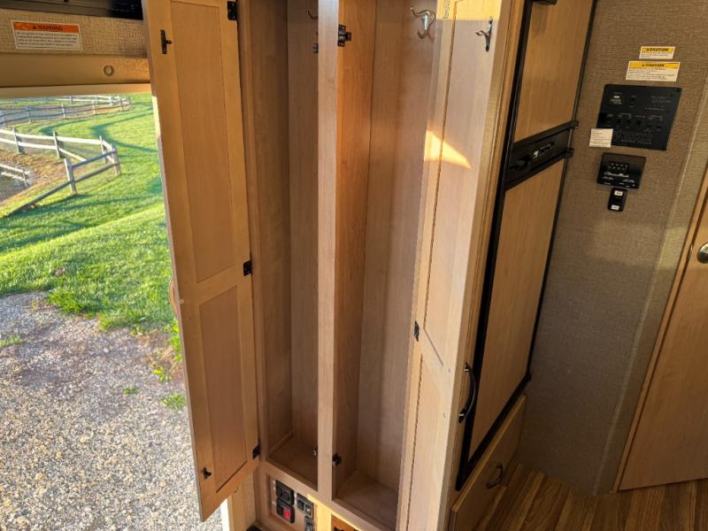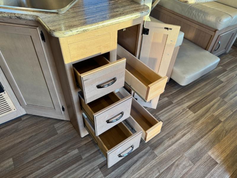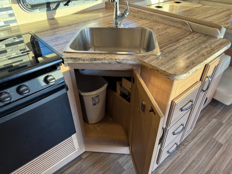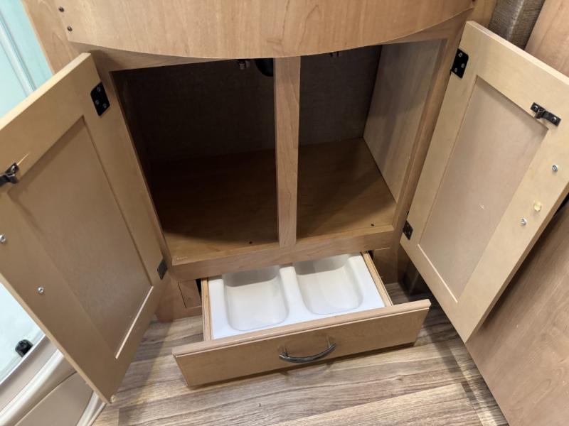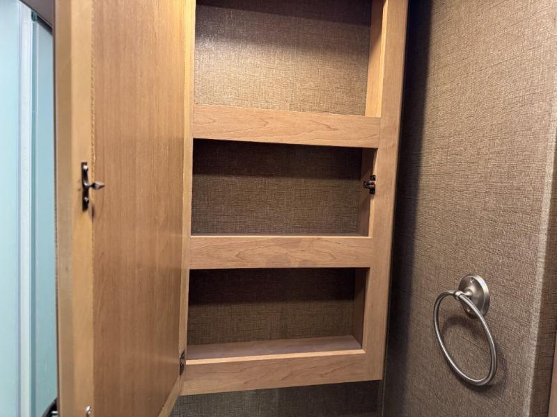 The kitchen amenities provide what you need to create meals and snacks on the go. There is a three burner range with microwave oven, a single kitchen sink, and overhead storage along with a refrigerator found on the opposite side. There is also a pull-out pantry for your non-perishables.