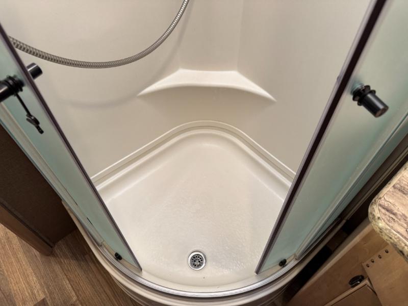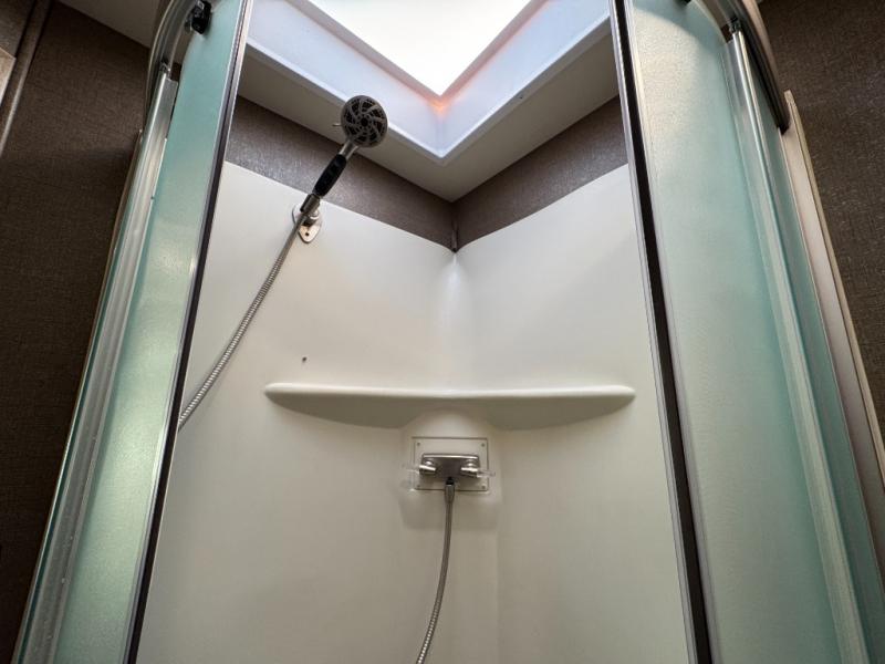 Heading towards the rear of the coach there is a full bath with angled shower, toilet and sink. The bath features dual entry doors which allows easy access from the living area and from the rear bedroom too.