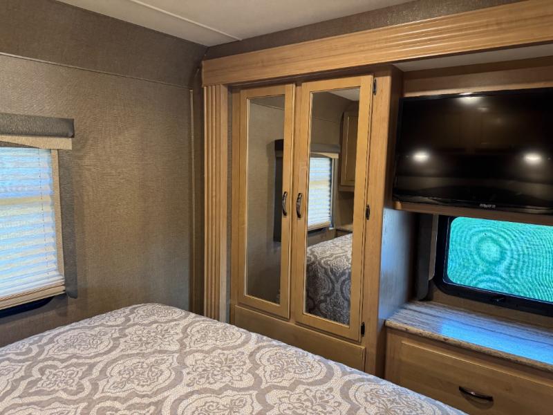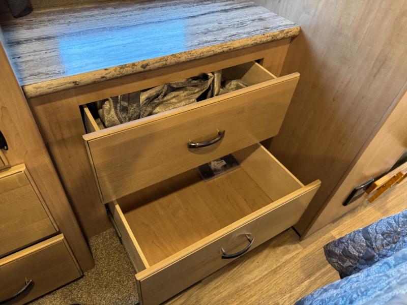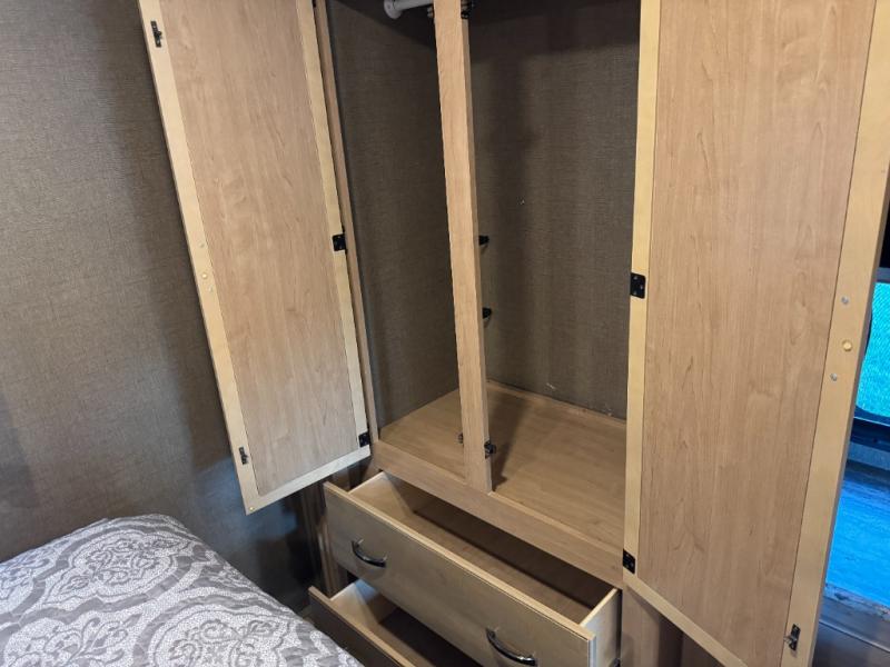 The rear bedroom features a queen bed with nightstands and overhead cabinets. There is also a closet and dresser along the full wall slide. Above the dresser there is a 32" LED TV for your enjoyment.