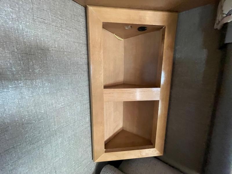 Above the entry door there is a 32" LED TV which can easily be viewed from the single slide out. The slide is along the road side and features a refrigerator and a 46" sofa bed. In front of the sofa there is a removable pedestal table where you can enjoy your meals.