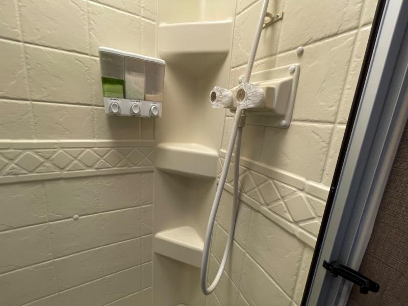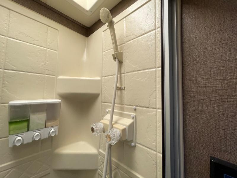 The bathroom is located in the very rear of this model. Here you will find a shower, sink, a medicine cabinet, a countertop extension, a toilet, and closet.