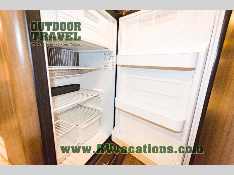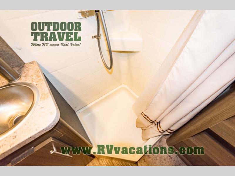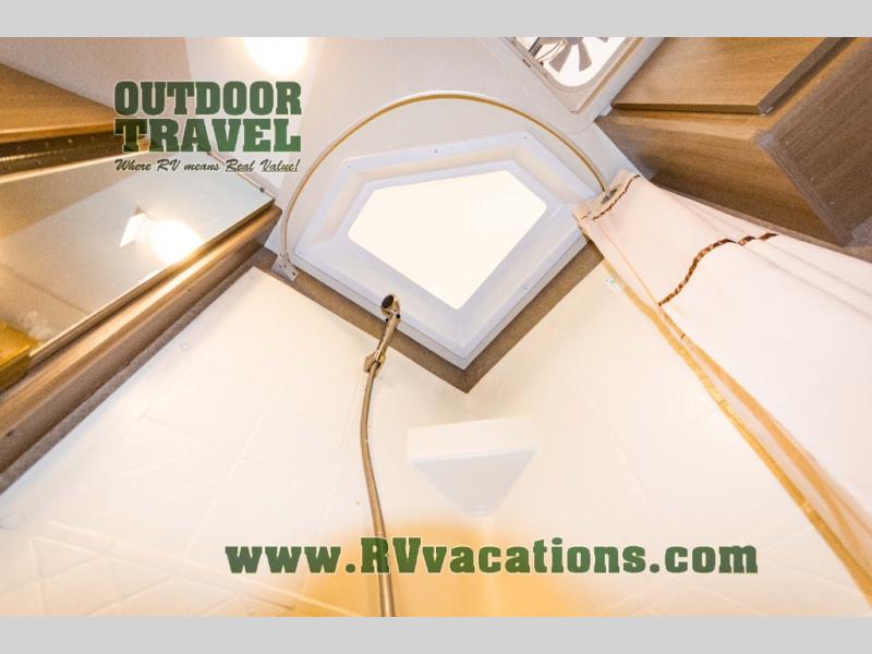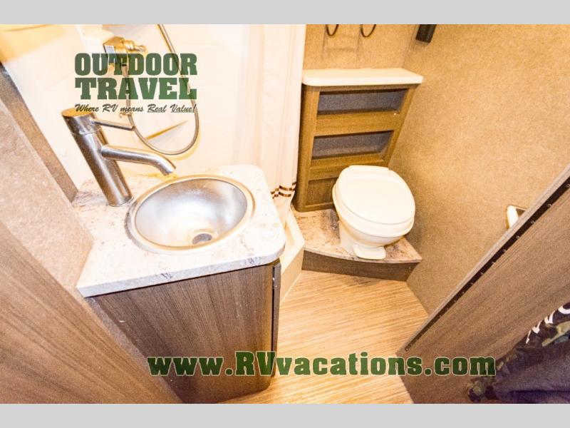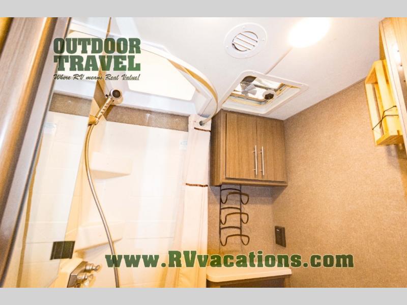 If you are looking for a slide out in the main living area, cushioned seating and a flip-up queen bed slide in the rear, plus a complete bath then take a look inside this double slide out Thor Motor Coach Compass 24TX class C diesel motor home. Above the cab you will find a built in skylight which allows so much natural lighting throughout. Within the slide out along the roadside you will find a 60" sofa plus there is a removable pedestal table where you can enjoy your meals. In the kitchen area you can quickly fix a snack or your evening meal at the single burner cooktop and your perishables can be stored in the 5.5 cu. ft. refrigerator. This bathroom features doors that swing out plus there is a 27"x27" shower and so much more!