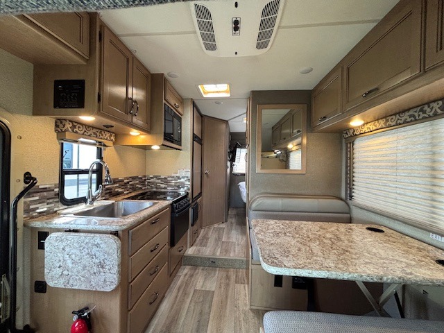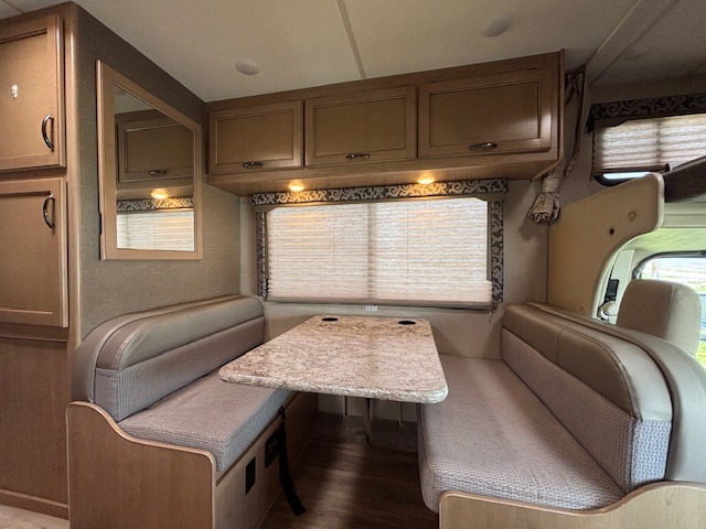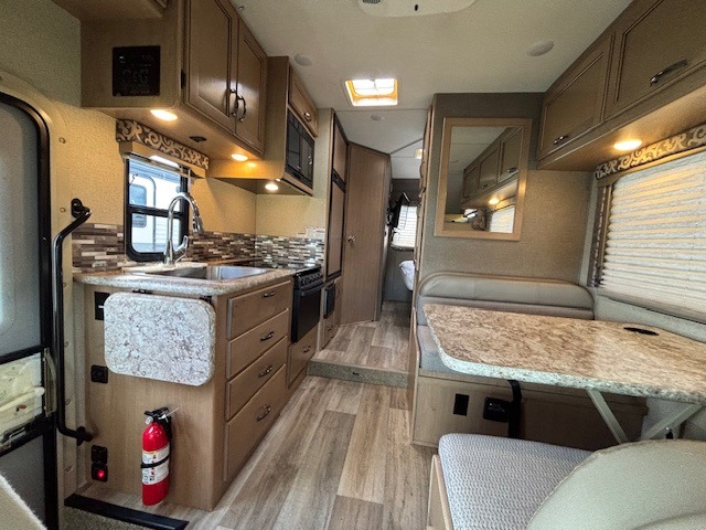 With any Four Winds class C gas coach you will enjoy the ease of driving and the affordable price. Inside you will find residential vinyl flooring, high-sheen cabinetry with nickel finish hardware, and laminate countertops making it easy to clean after a weekend get-a-away or a long vacation. Each model also includes a Dream dinette for playing games or eating meals. The stainless steel bathroom sink and foot flush porcelain toilet provide a convenience every where you stop. It's time to realize your dreams can come true with a Four Winds coach.
