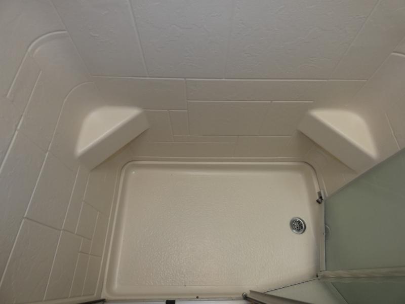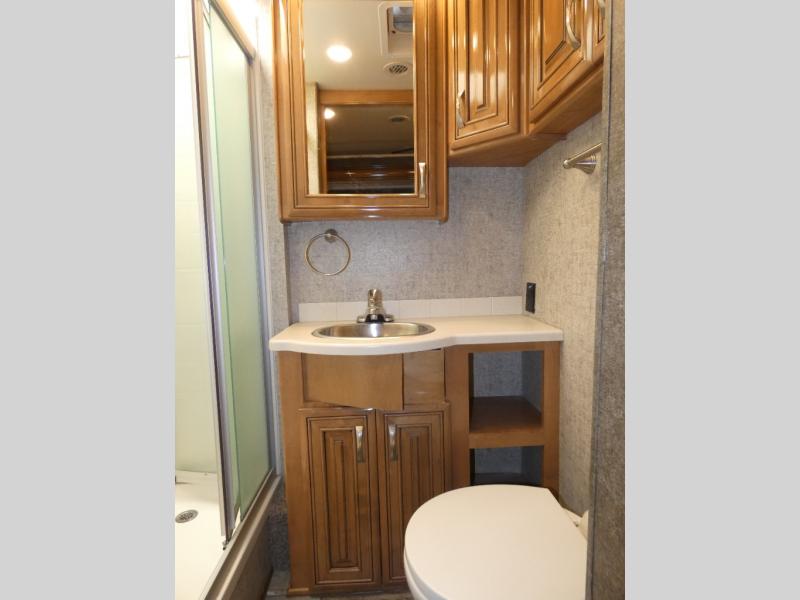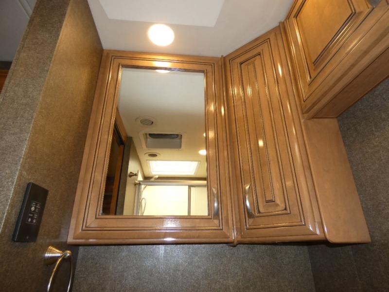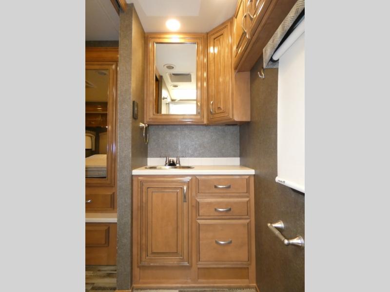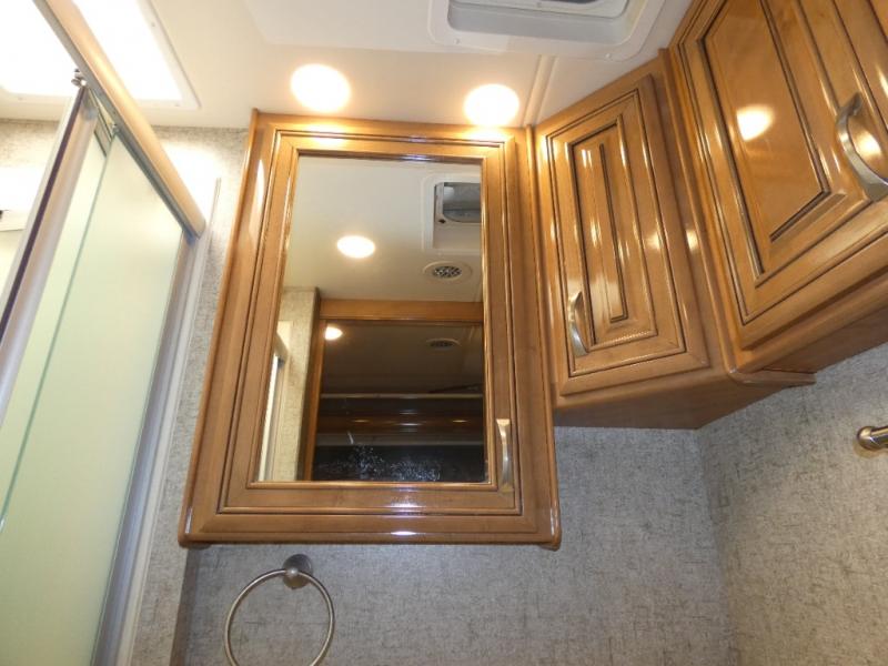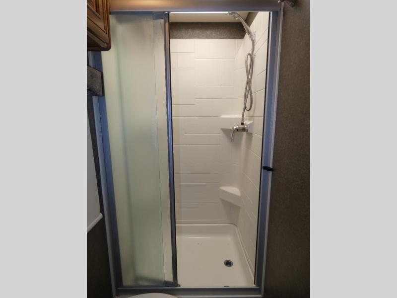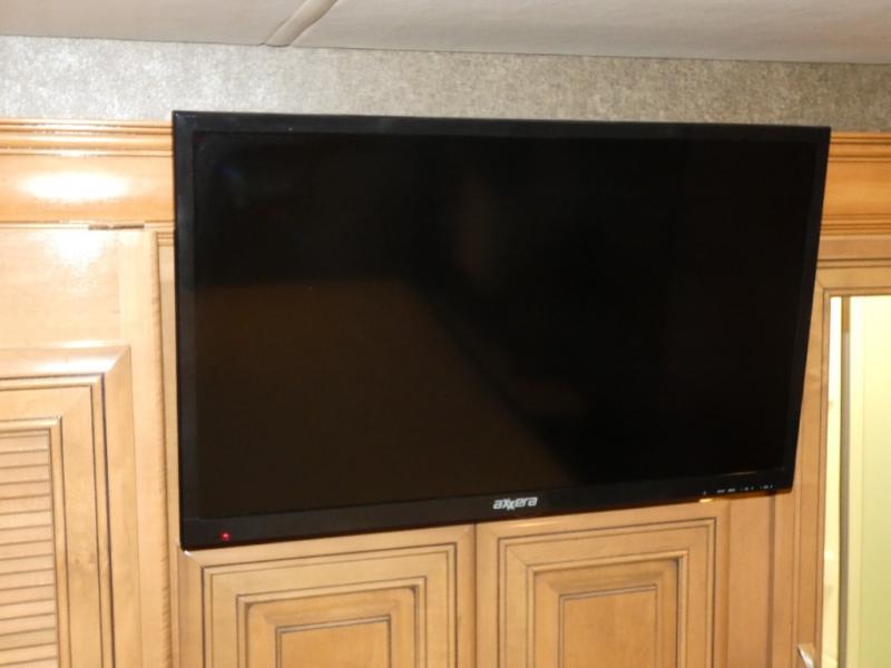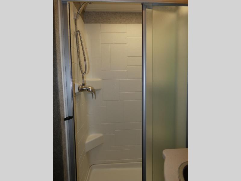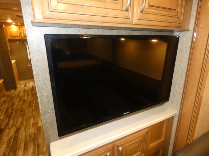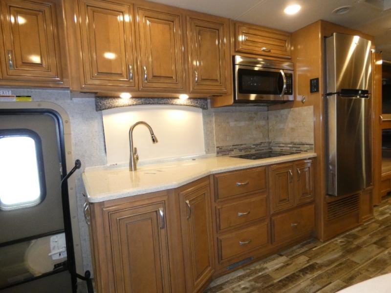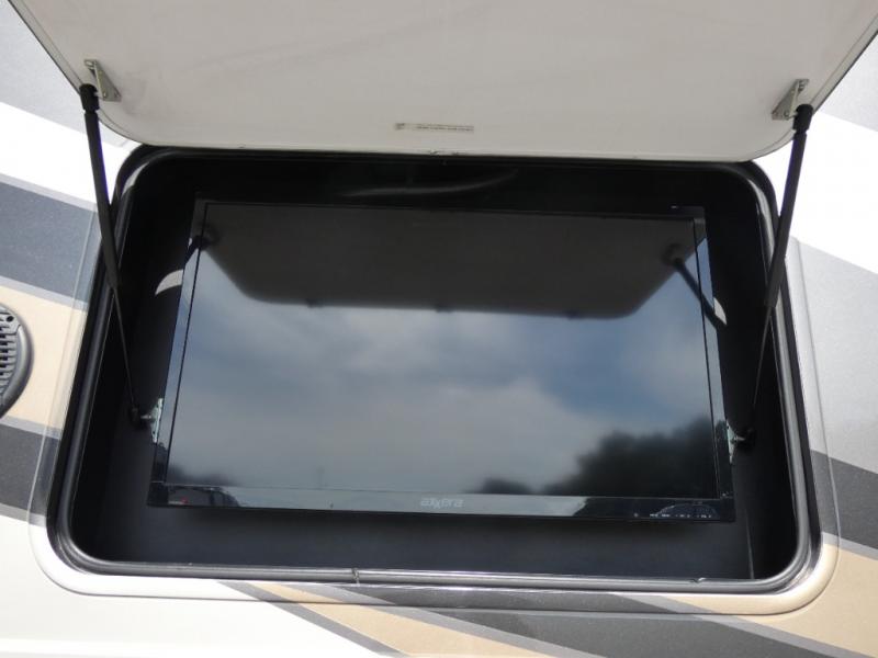 Next to the entry along the curb side wall there is a double kitchen sink, counter space, two burner range with microwave above, a residential refrigerator, and a pantry. On the opposite side you will enjoy a dream dinette and sofa slide out. You may choose optional theater seating for two in place of the sofa if you like. When it's time to watch a movie or the big game, the Always-in-View 40" LED TV along the interior wall is available.
