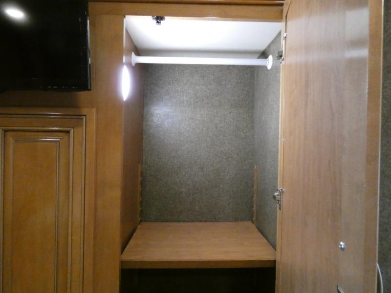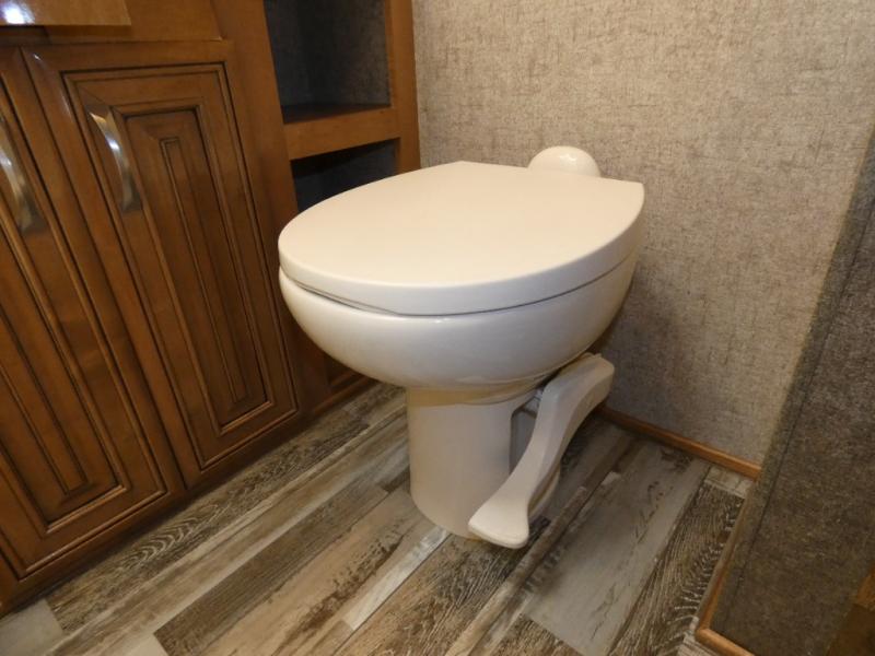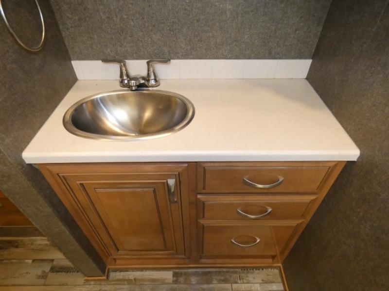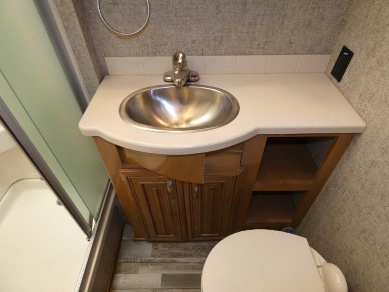 Next, the first full bath includes a shower, toilet, vanity and sink with linen storage. On the opposite side there is a slide out set of bunks that also converts to a sofa and closet. Continuing in the slide you will find a washer and dryer combo prepped space, 32" LED TV, dresser, and closet in the bedroom. A Tilt-A-View inclining king bed slide with nightstands is across from the TV. As you walk through the bedroom the second full bath is in the rear of the coach. There is a shower, toilet, vanity with sink, and overhead storage for your toiletries and things.