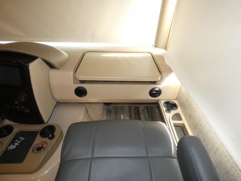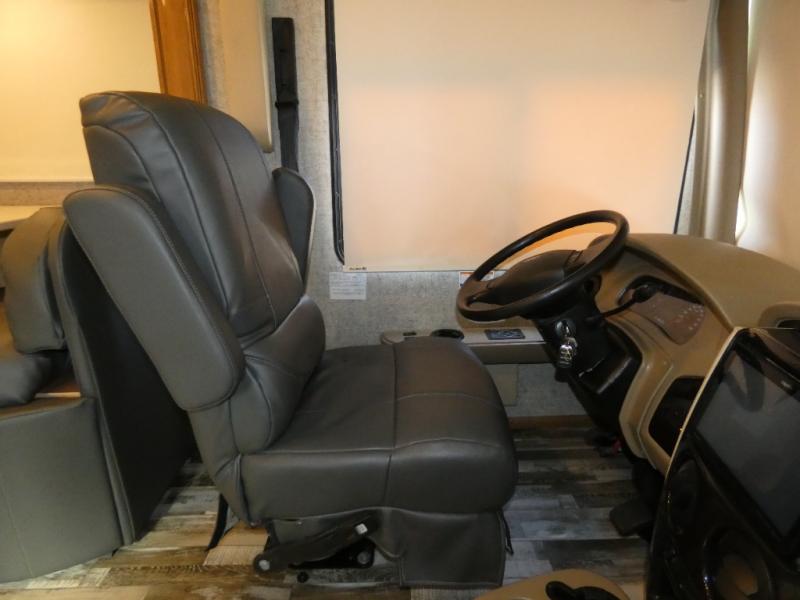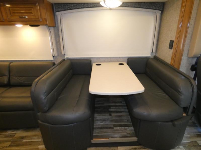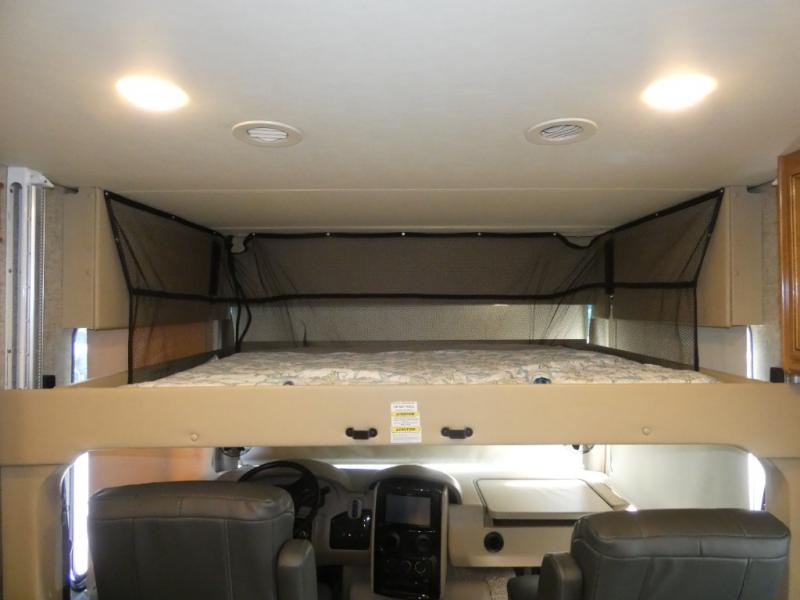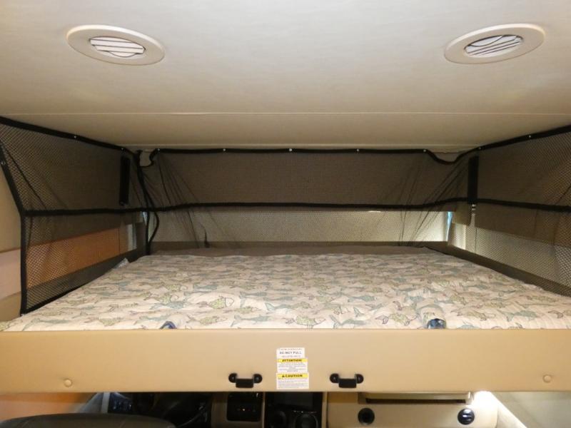 Step inside behind the cab area to see a coffee table between the captain's chairs and a drop-down overhead bunk above for extra sleeping space.