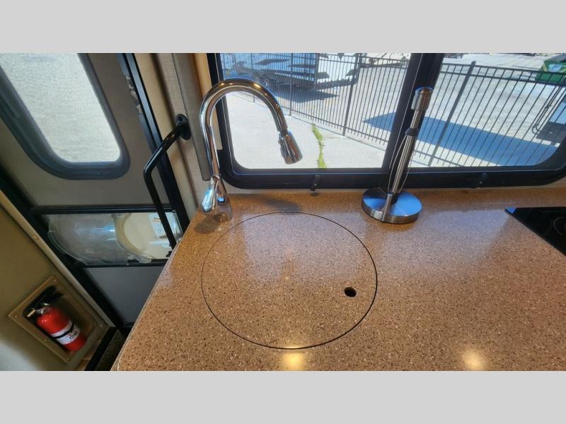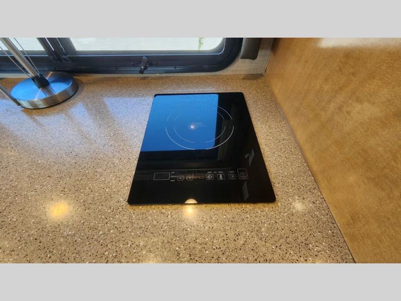As you enter this model, to the left there is a flip-up counter top which is sure to come in handy for meal prep. Continuing along the curbside you will find a sink, one burner range, an overhead microwave and cabinet, plus a refrigerator. Above the entry door, there is a 32" LED TV for your viewing enjoyment. Above the cab, you will find a bunk with a 36" x 75" sleeping area which is ideal for a child or one adult.