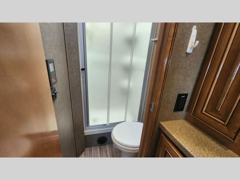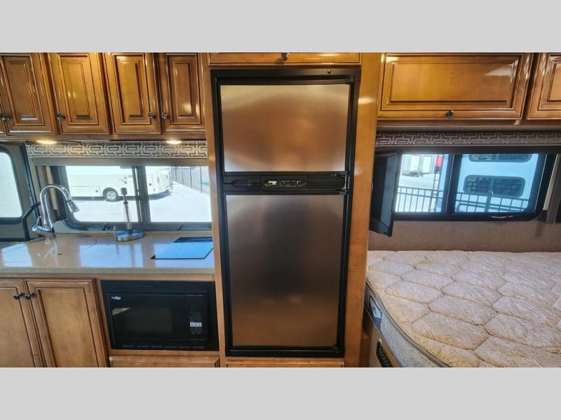 When it is time to turn in for the night, you will find yourself being drawn to the rear full-size bed. There is a privacy curtain along the foot of the bed, two overhead cabinets for your personal belongings, and a 28" LED TV along the wall.