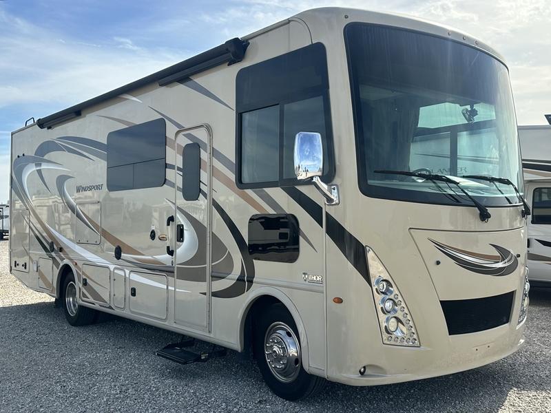 You will find much to love about all Windsport models whether you are out for a long road trip across the country, or a weekend tailgating party close to home. All Windsport models feature Leatherette furniture, solid surface countertops, and raised panel upper cabinet doors with nickel finish hardware and glass inserts on select doors. You will also find added sleeping space in the drop-down cabover bunk that the kids are sure to love. With the swivel and reclining captain's chairs you can easily bring them into a conversation area in the living space once parked, and there is a dash workstation with 110-volt and 12-volt outlets at the passenger side for those who need to do a bit of work while traveling, or for those who just enjoy surfing the internet. On the outside, enjoy Robocast storage compartments, an outdoor shower, plus a 32" LED TV on a manual swivel, and a legless lateral power awning with integrated LED lighting. Make any Windsport class A gas motor home by Thor Motor Coach your new home-away-from-home today!