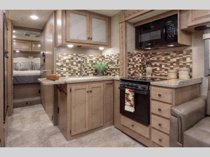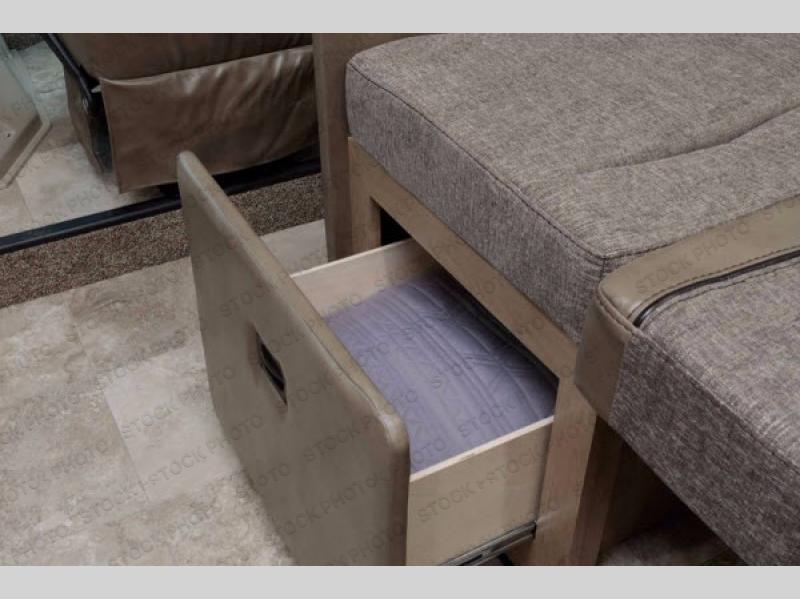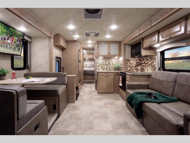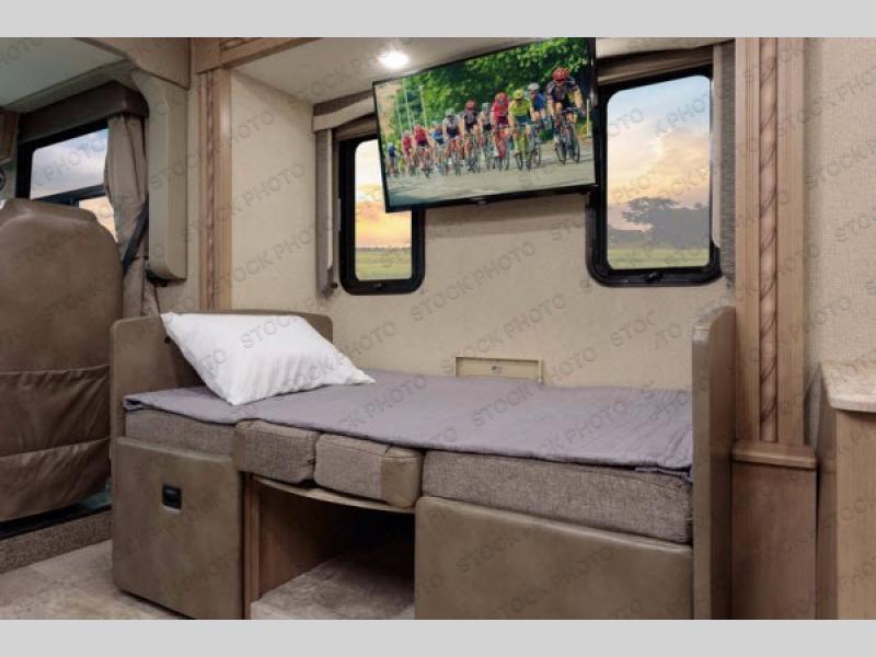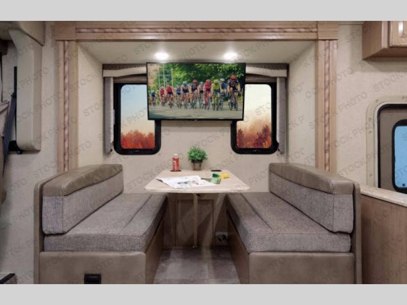 You will find much to love about all Windsport models whether you are out for a long road trip across the country, or a weekend tailgating party close to home. All Windsport models feature Leatherette furniture, solid surface countertops, and raised panel upper cabinet doors with nickel finish hardware and glass inserts on select doors. You will also find added sleeping space in the drop-down cabover bunk that the kids are sure to love. With the swivel and reclining captain's chairs you can easily bring them into a conversation area in the living space once parked, and there is a dash workstation with 110-volt and 12-volt outlets at the passenger side for those who need to do a bit of work while traveling, or for those who just enjoy surfing the internet. On the outside, enjoy Robocast storage compartments, an outdoor shower, plus a 32" LED TV on a manual swivel, and a legless lateral power awning with integrated LED lighting. Make any Windsport class A gas motor home by Thor Motor Coach your new home-away-from-home today!