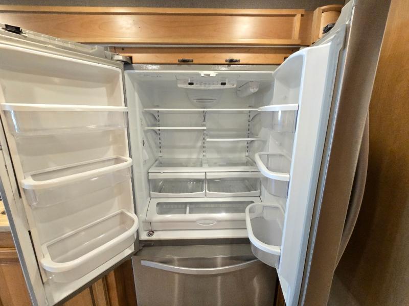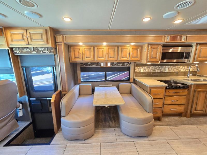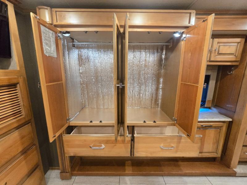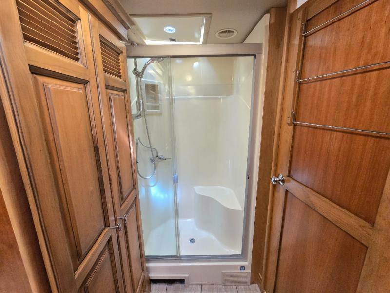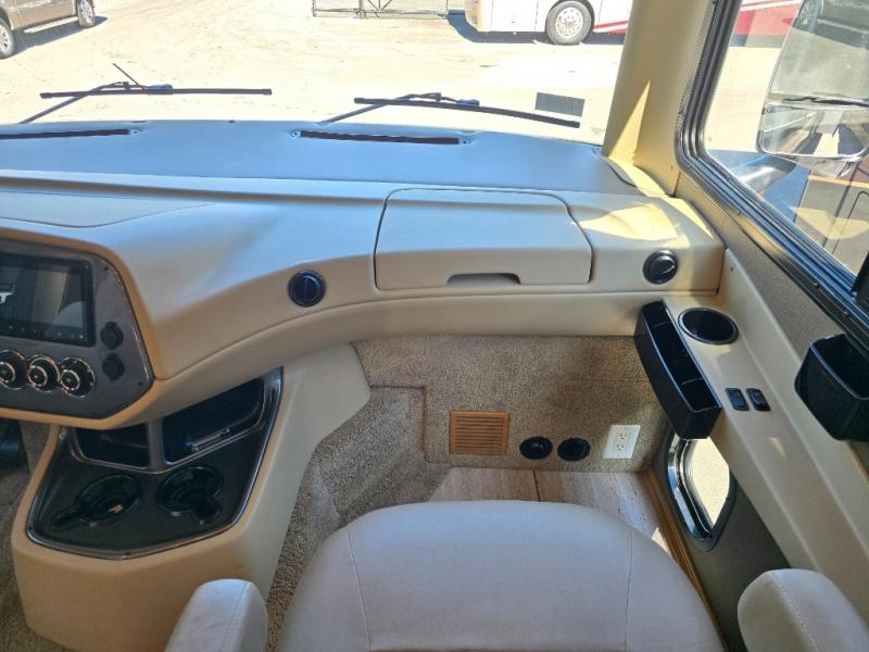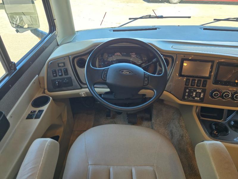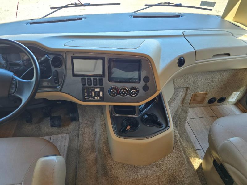 As you enter this motor home, you will find that there are two slide outs in the main living area. The first slide out has a booth dinette, three burner range, microwave, double kitchen sink, overhead cabinet for dishes, and a refrigerator. In place of the booth dinette, you can choose to have an optional dinette with a computer work station. The slide opposite has a sofa bed or you can choose an optional L-shaped chaise sofa bed with coffee table. Adjacent to the slide you will find a TV, and in the cab, there are comfortable seats, overhead storage on either side and a TV.