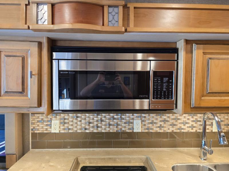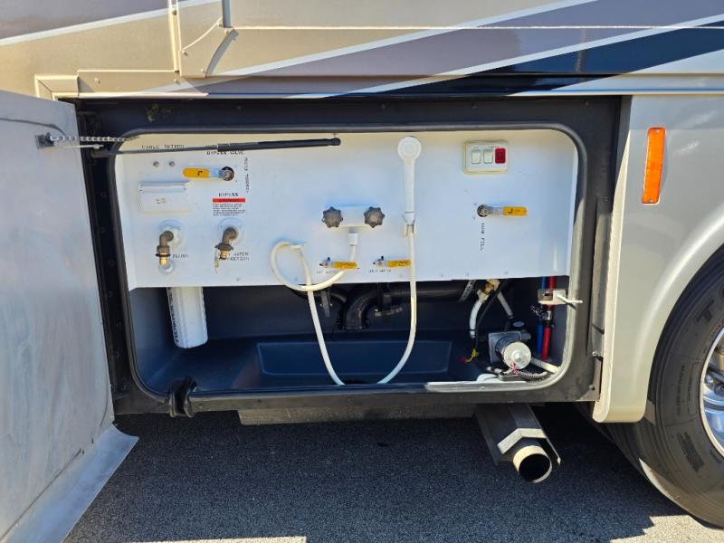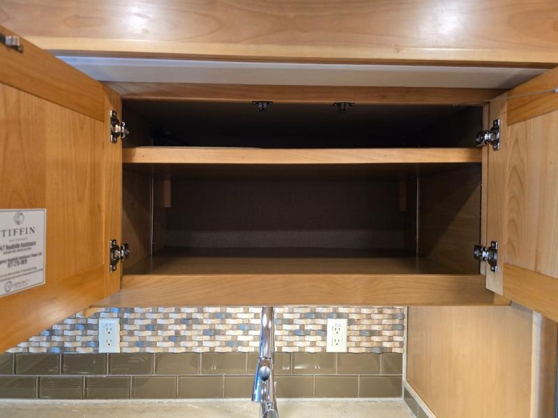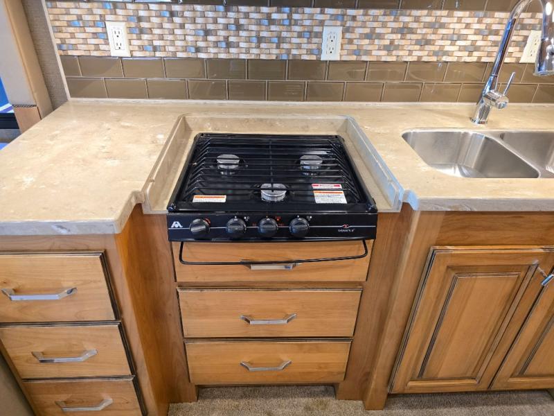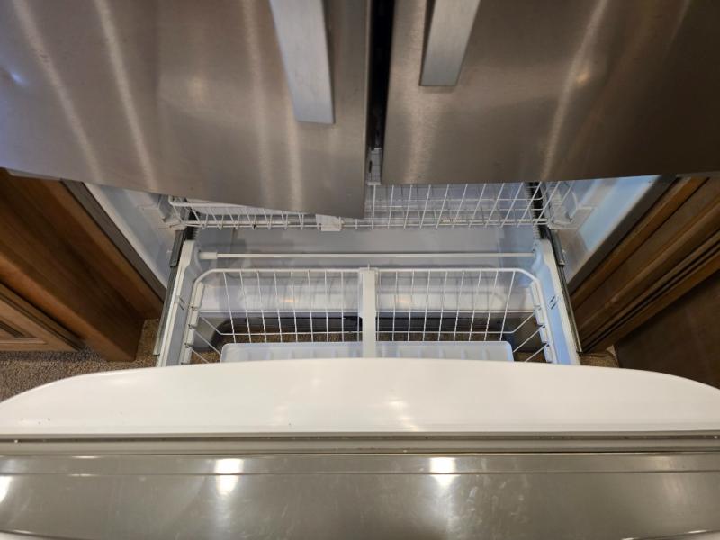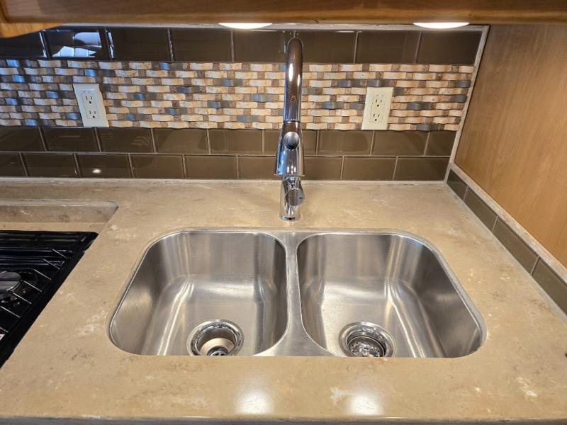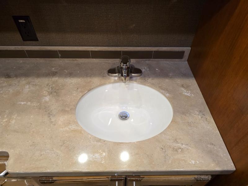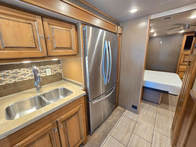 As you enter this motor home, you will find that there are two slide outs in the main living area. The first slide out has a booth dinette, three burner range, microwave, double kitchen sink, overhead cabinet for dishes, and a refrigerator. In place of the booth dinette, you can choose to have an optional dinette with a computer work station. The slide opposite has a sofa bed or you can choose an optional L-shaped chaise sofa bed with coffee table. Adjacent to the slide you will find a TV, and in the cab, there are comfortable seats, overhead storage on either side and a TV.