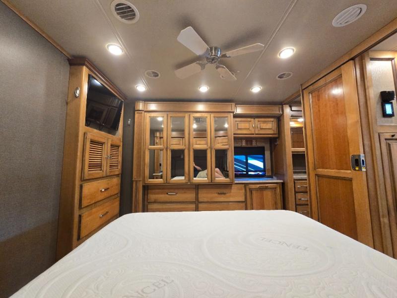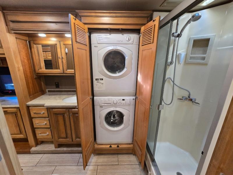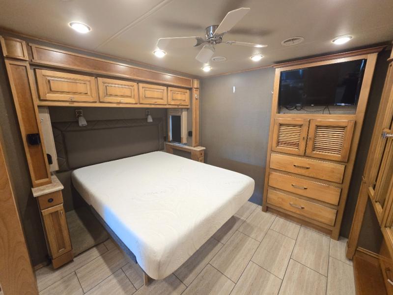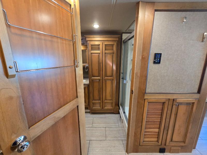 Enter into the rear bedroom and find a slide out with a queen bed or optional king, nightstands, and an overhead cabinet along one side. Along the rear wall of the room, there is a TV for your enjoyment. Across from the bed, there is a slide out with a wardrobe, overhead cabinet with drawers below, and continuing into the bathroom the slide has a sink, and an optional washer/dryer. The bathroom also has a shower, linen cabinet, and toilet. You will find easy access to the bathroom from either the hallway or from the bedroom.