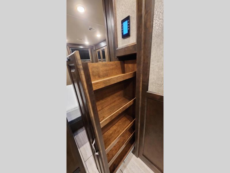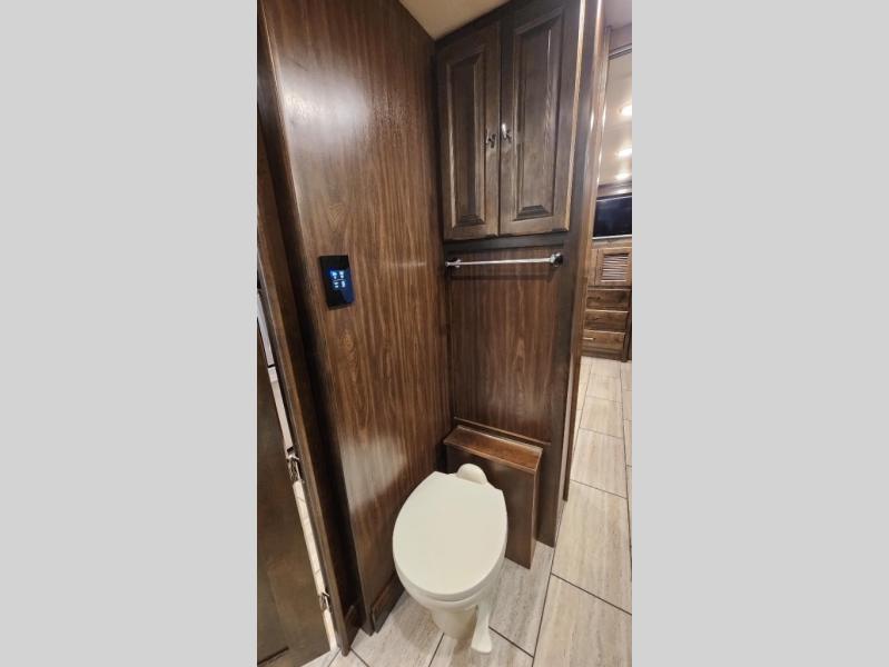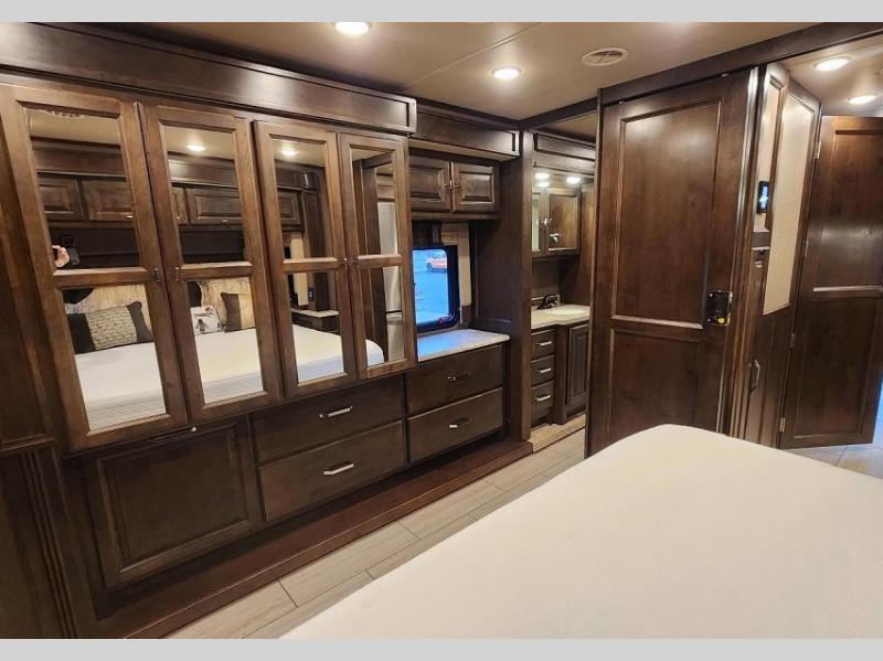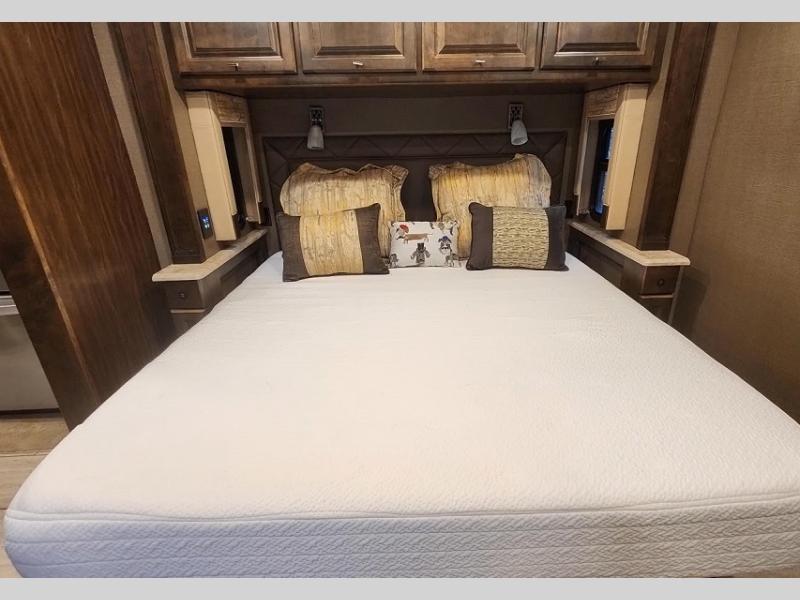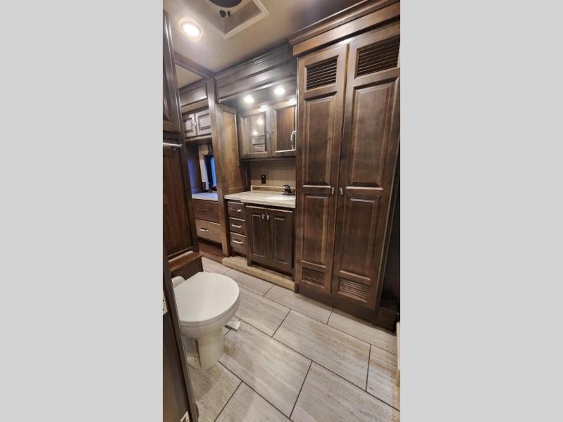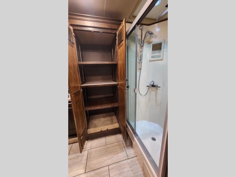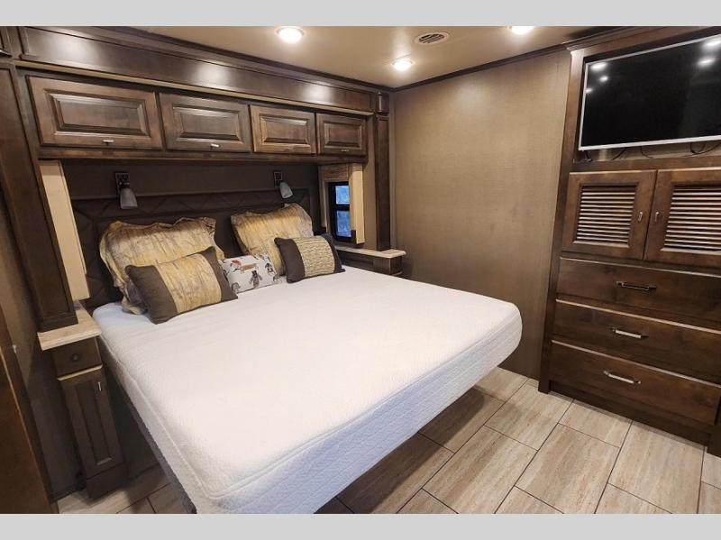 Enter into the rear bedroom and find a slide out with a queen bed or optional king, nightstands, and an overhead cabinet along one side. Along the rear wall of the room, there is a TV for your enjoyment. Across from the bed, there is a slide out with a wardrobe, overhead cabinet with drawers below, and continuing into the bathroom the slide has a sink, and an optional washer/dryer. The bathroom also has a shower, linen cabinet, and toilet. You will find easy access to the bathroom from either the hallway or from the bedroom.