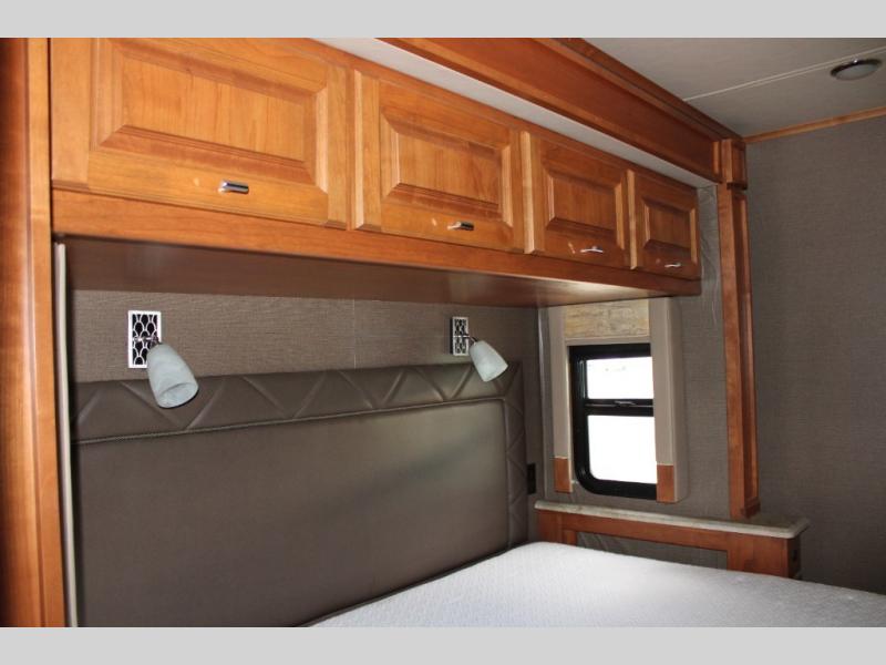 Features a queen bed (optional king), nightstands, overhead cabinetry, and a full wardrobe with drawers -