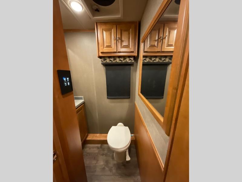 This class A gas motorhome includes a full rear bathroom with a sliding entrance door. There is a corner vanity with sink and overhead cabinet, a shower, linen storage, and a toilet.