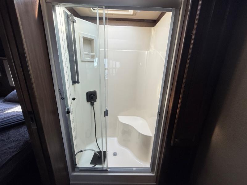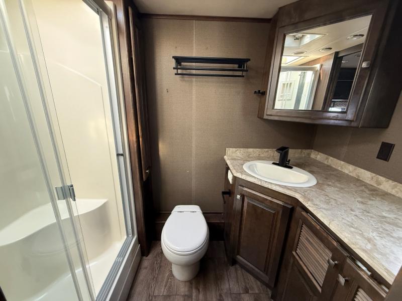 This class A gas motorhome includes a full rear bathroom with a sliding entrance door. There is a corner vanity with sink and overhead cabinet, a shower, linen storage, and a toilet.