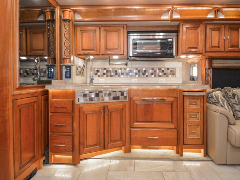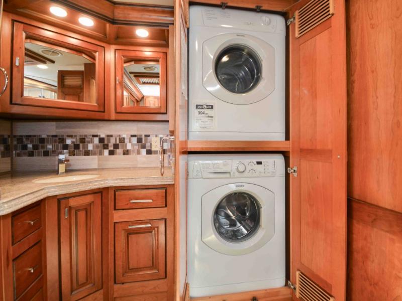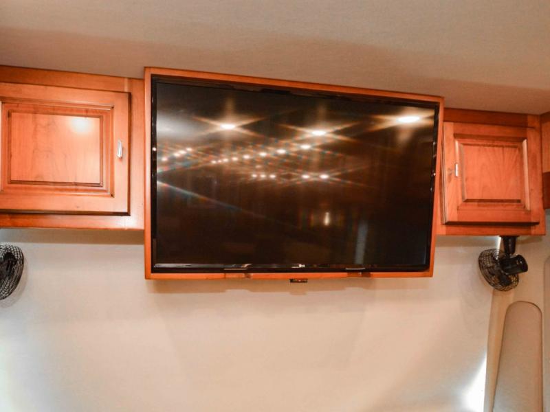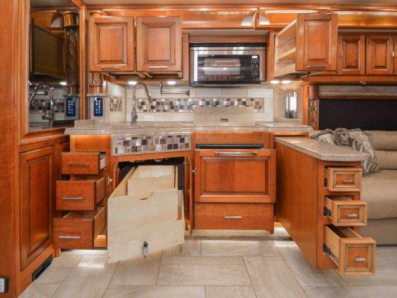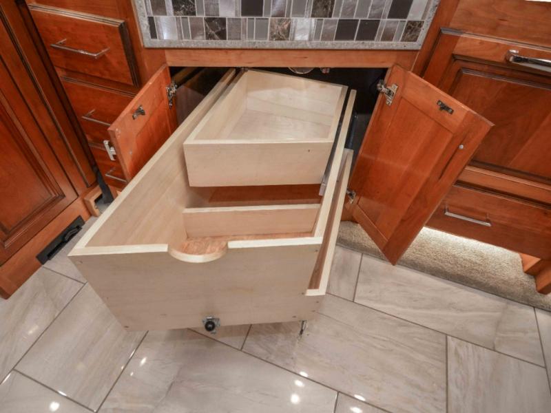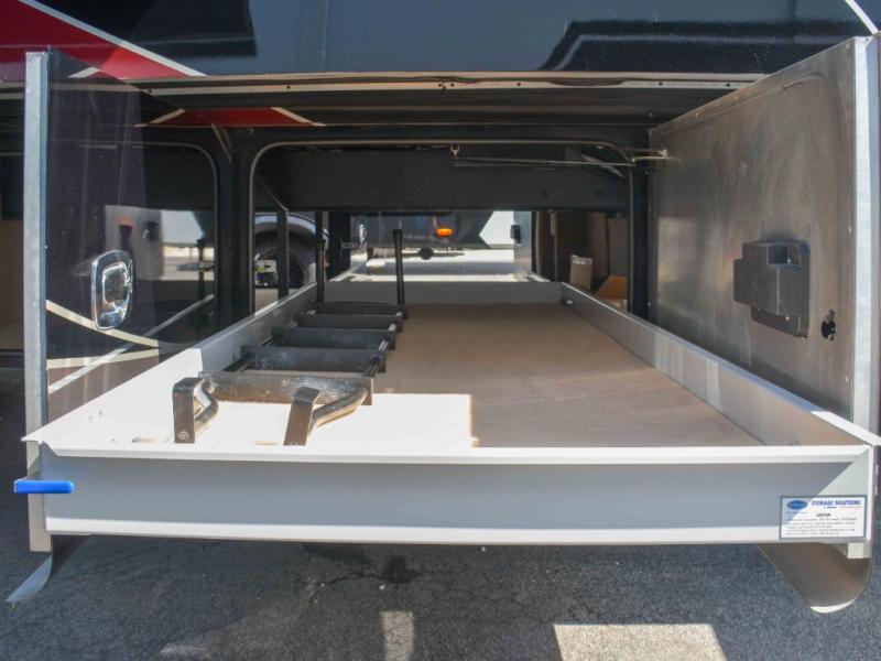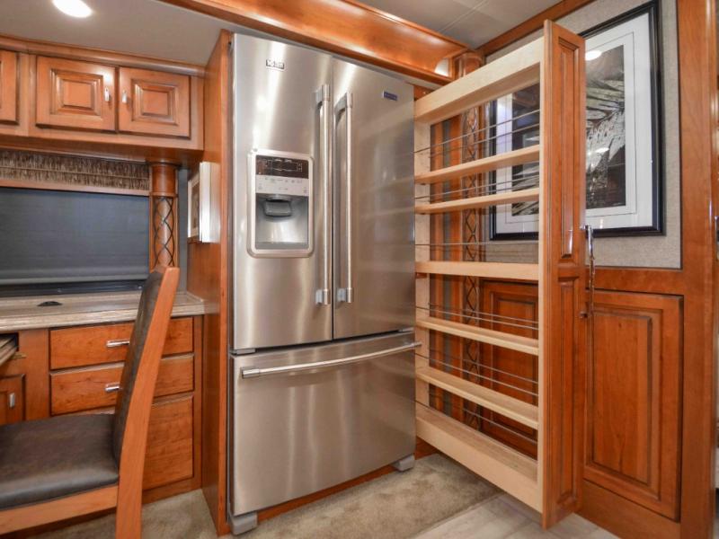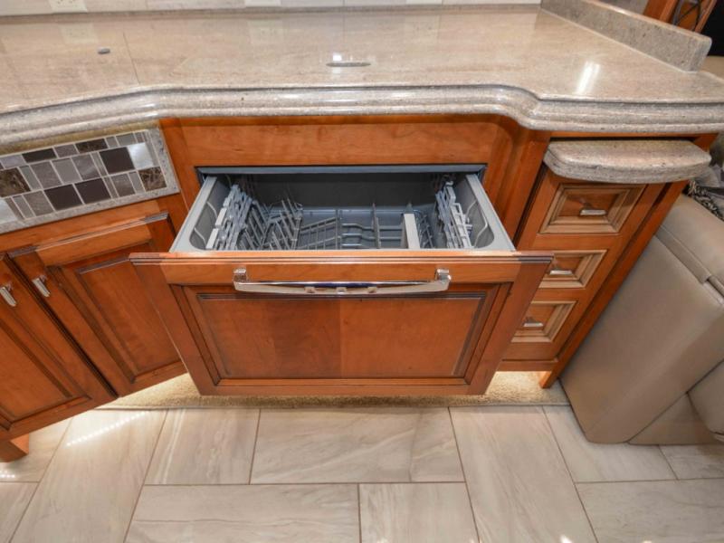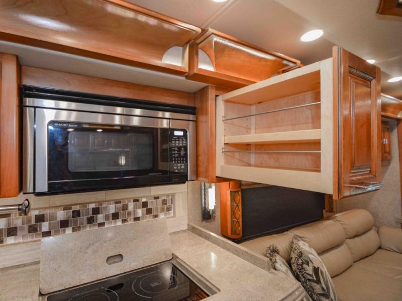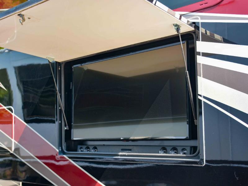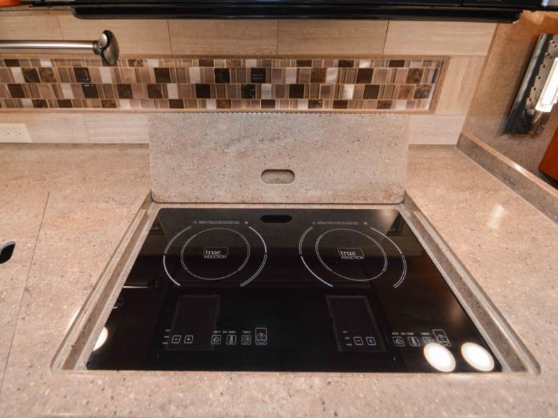 The all-electric residential kitchen provides room to stock up for extended stays with the stainless steel residential refrigerator, full-size pantry, and pull-out cabinet storage. From light meals to serving a crowd, the Induction Cooktop, Microwave Convection Oven, and dishwasher in a drawer have you covered. Enjoy get-togethers under the power awning while the sidewall TV and sound bar entertain. The pass-through storage compartments and slide-out tray provide for easy set-up.
