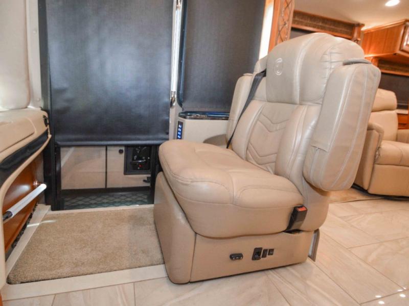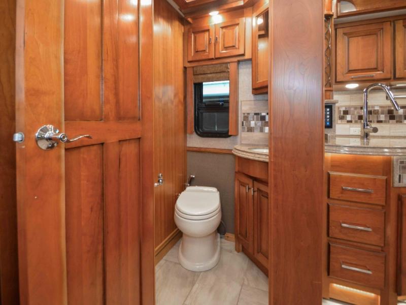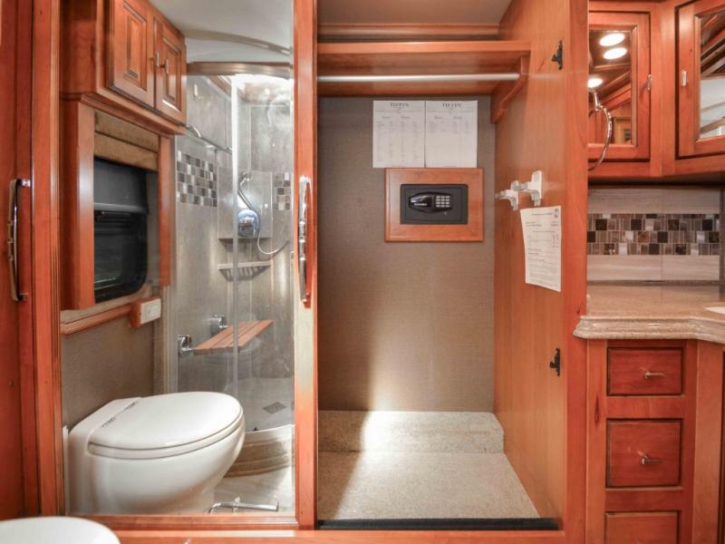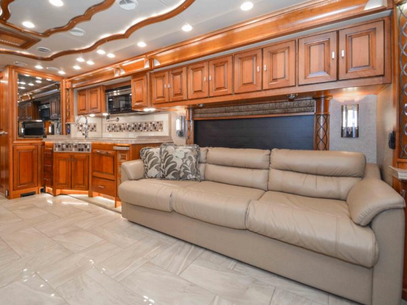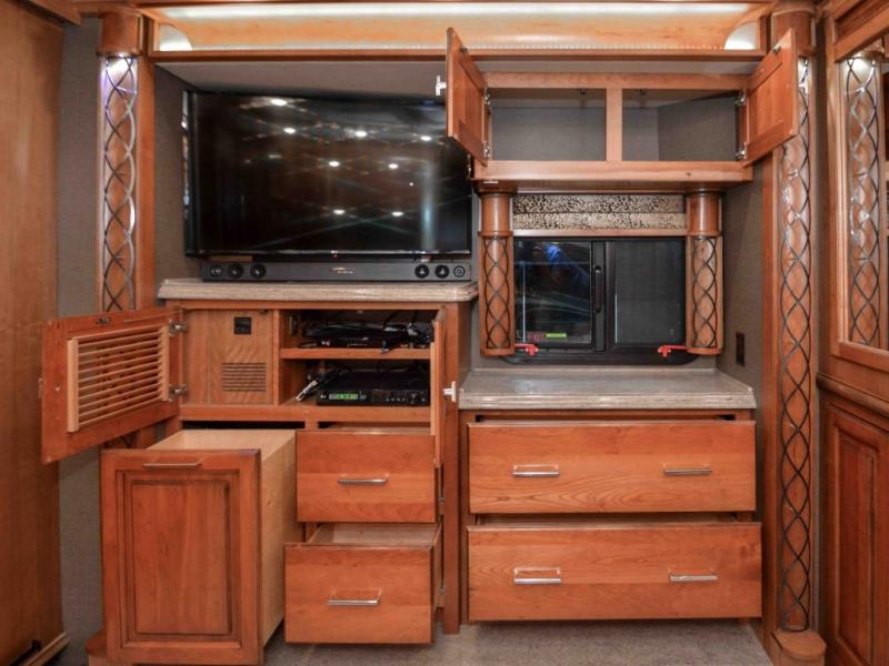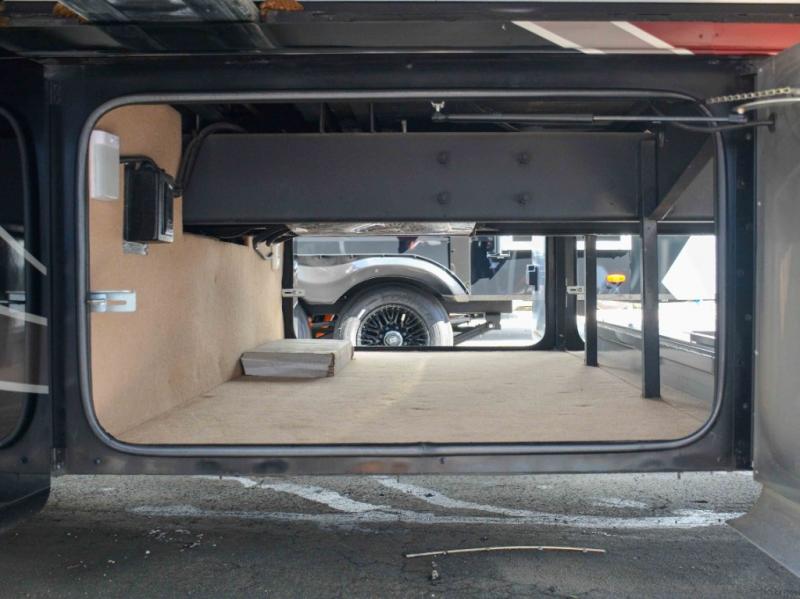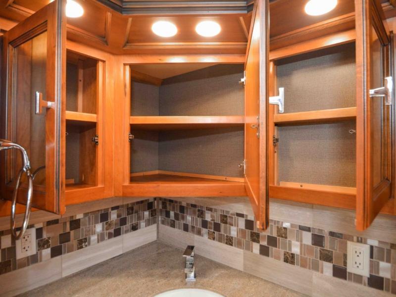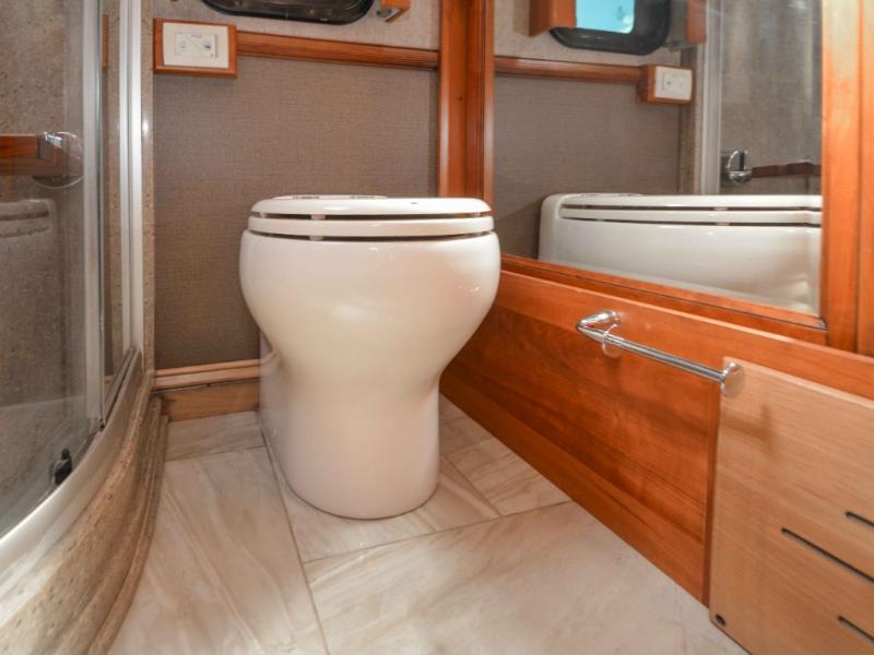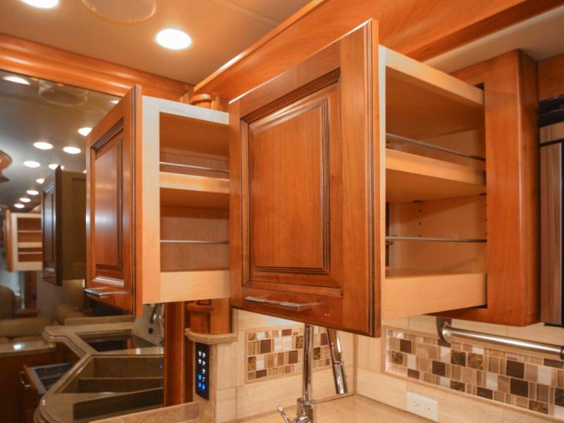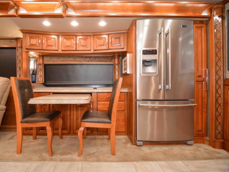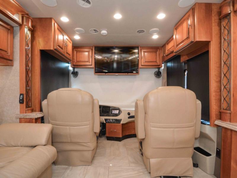 The all-electric residential kitchen provides room to stock up for extended stays with the stainless steel residential refrigerator, full-size pantry, and pull-out cabinet storage. From light meals to serving a crowd, the Induction Cooktop, Microwave Convection Oven, and dishwasher in a drawer have you covered. Enjoy get-togethers under the power awning while the sidewall TV and sound bar entertain. The pass-through storage compartments and slide-out tray provide for easy set-up.