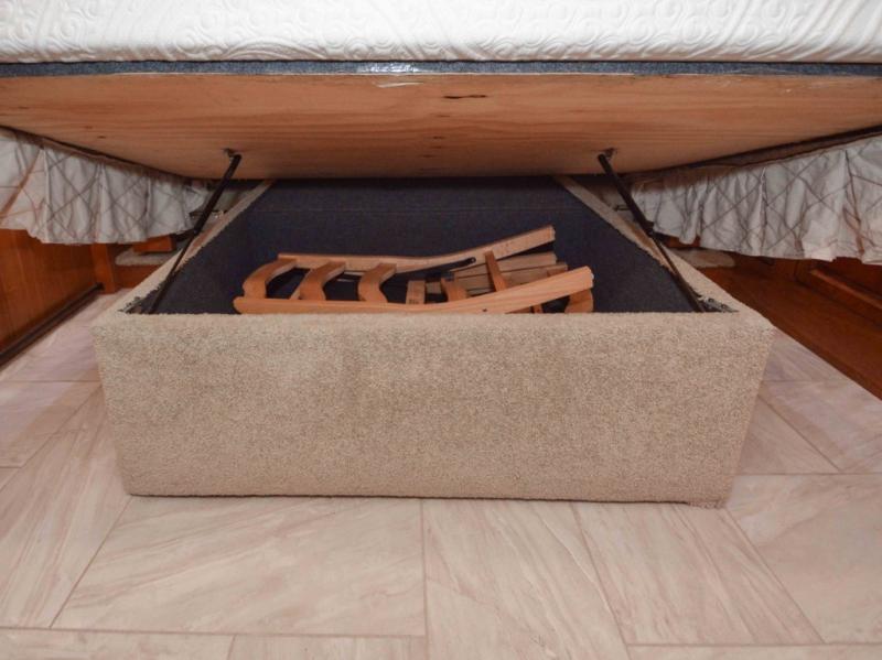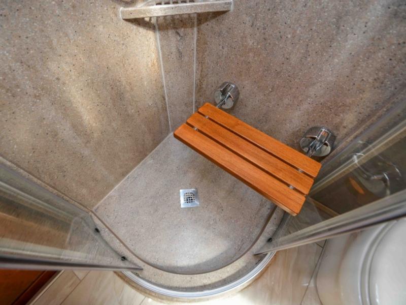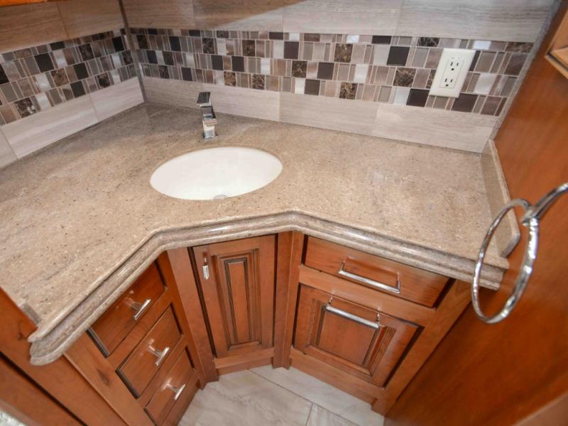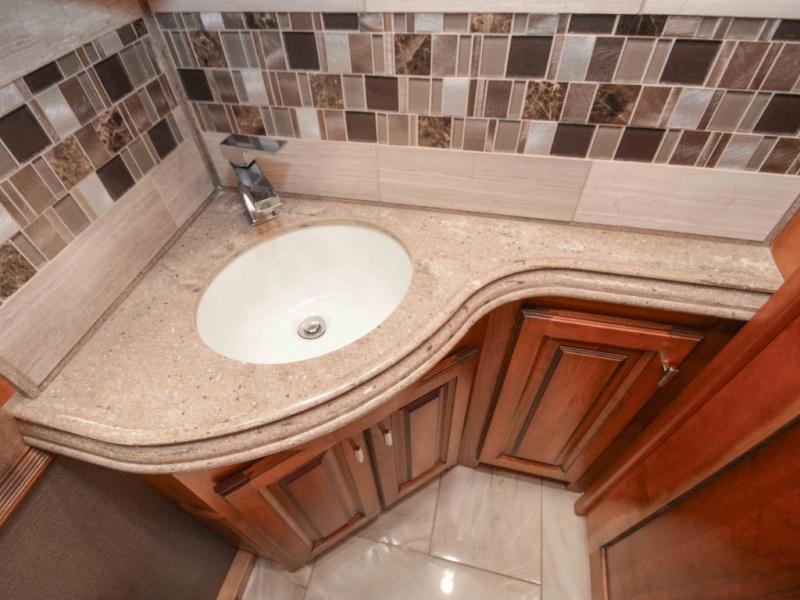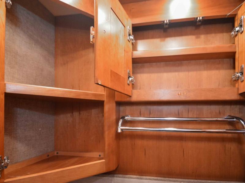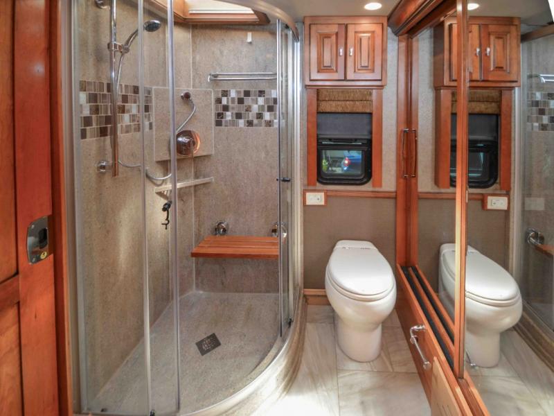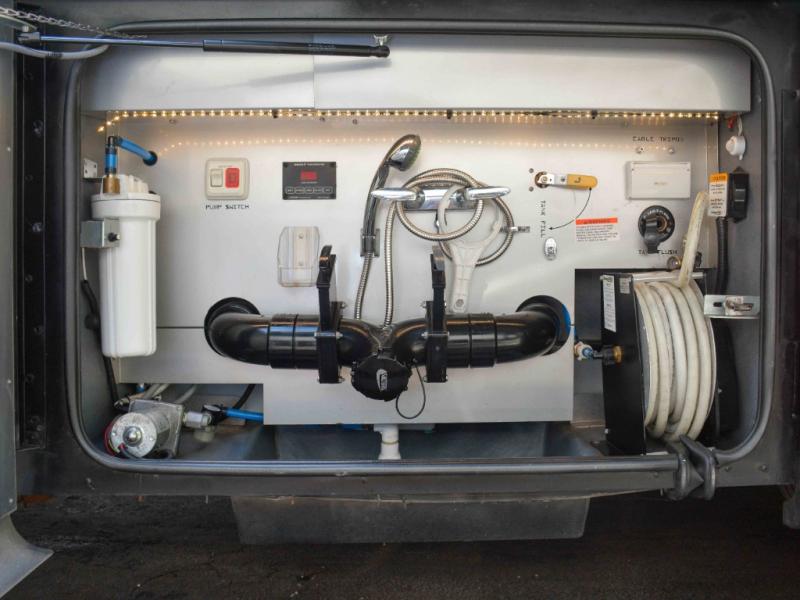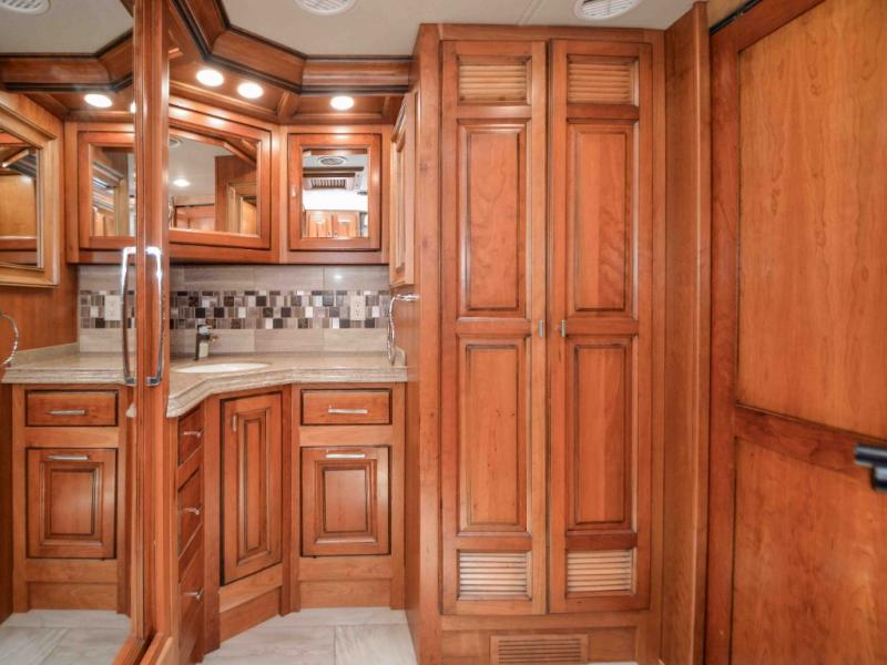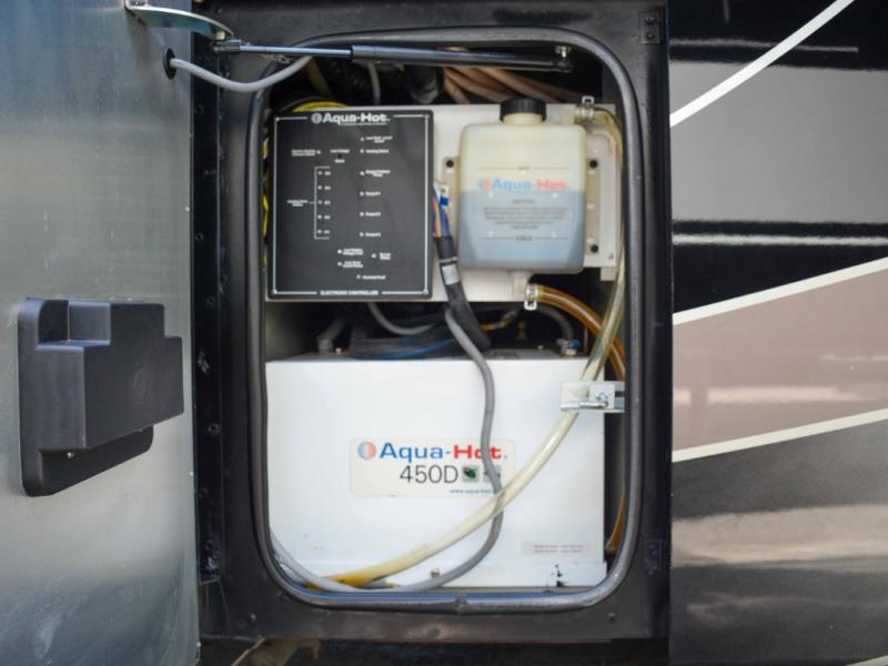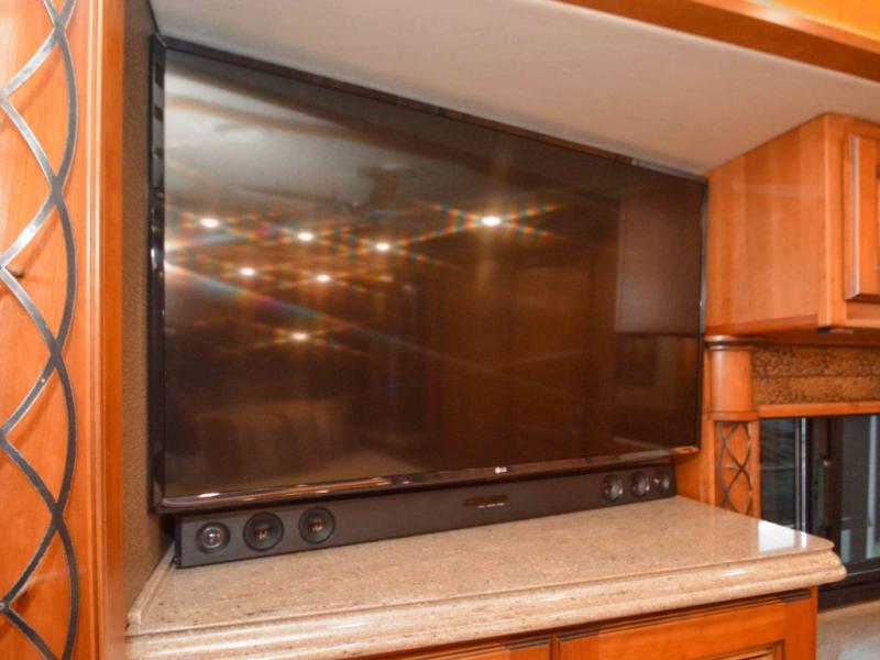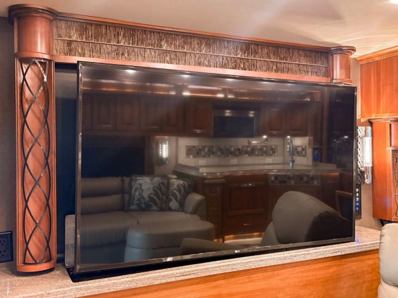 The all-electric residential kitchen provides room to stock up for extended stays with the stainless steel residential refrigerator, full-size pantry, and pull-out cabinet storage. From light meals to serving a crowd, the Induction Cooktop, Microwave Convection Oven, and dishwasher in a drawer have you covered. Enjoy get-togethers under the power awning while the sidewall TV and sound bar entertain. The pass-through storage compartments and slide-out tray provide for easy set-up.