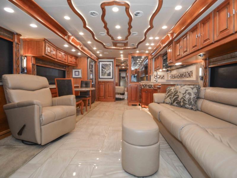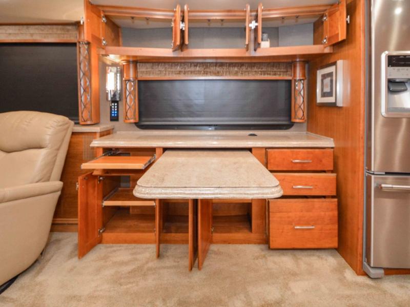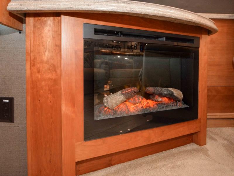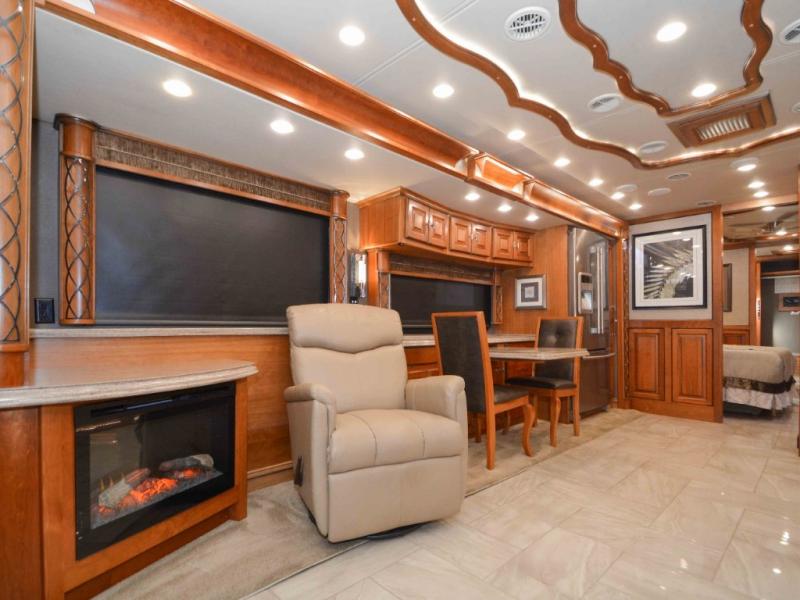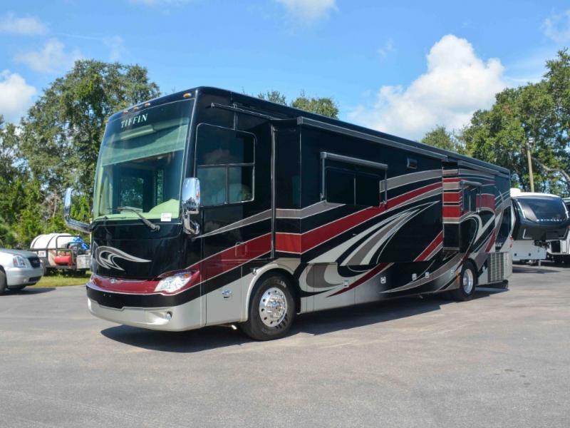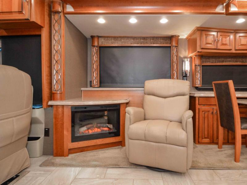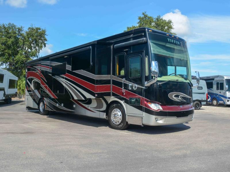 Discover luxury and comfort aboard this Tiffin Allegro Class A diesel motorhome. Four slides open up to an elegant and spacious bath and a half floor plan presenting high-end amenities and extensive design detail. Handcrafted hardwood cabinetry complemented by decorative solid surfaces, tile backsplashes, and polished porcelain tile flooring set the stage in this beautiful coach. The living area offers a hide-a-bed sofa with ottoman, recliner next to the fireplace, and a buffet dinette that includes a work station as well. There's never a bad seat in the house with both an overhead TV and telescoping TV complemented by surround sound.