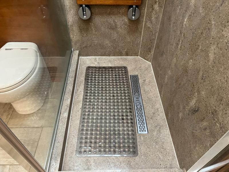 High-quality fixtures, a spacious shower, and smart storage bring everyday comfort to travel life.