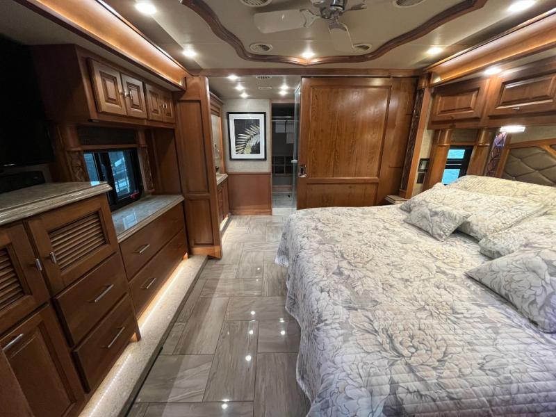 The master bedroom serves as a peaceful oasis after a day of travel. A large, comfortable bed, plentiful storage, wardrobe closets, and soft lighting create a private resting space with residential comfort. The quiet, well-insulated design makes it easy to relax and recharge before your next adventure.