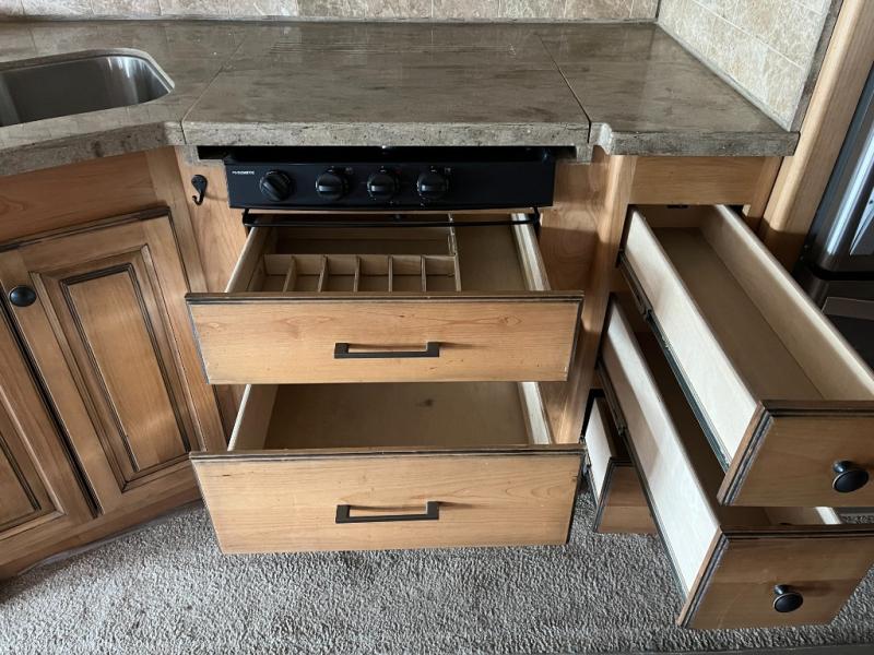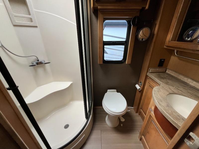 Theater Seating • Spacious Galley Kitchen • Large Entertainment Center • Full Bathroom • Premium Upholstery • Slide-Out Living Space