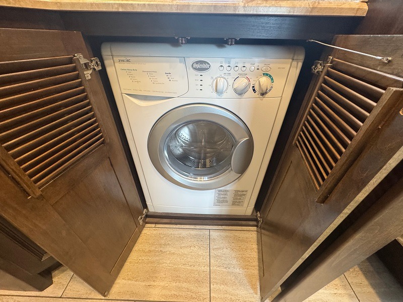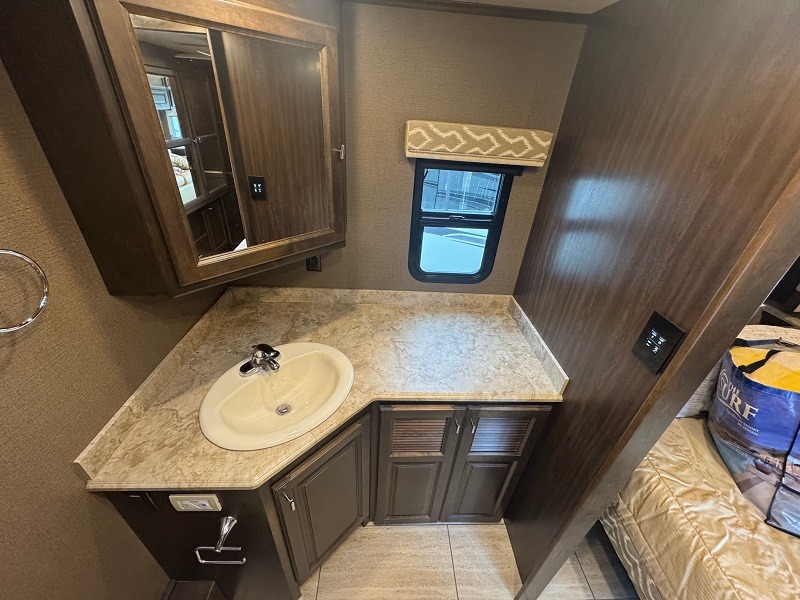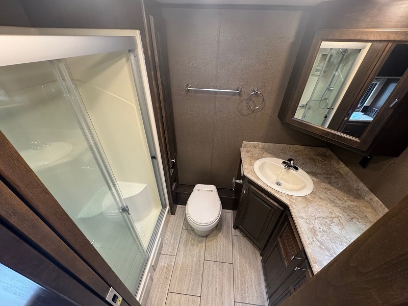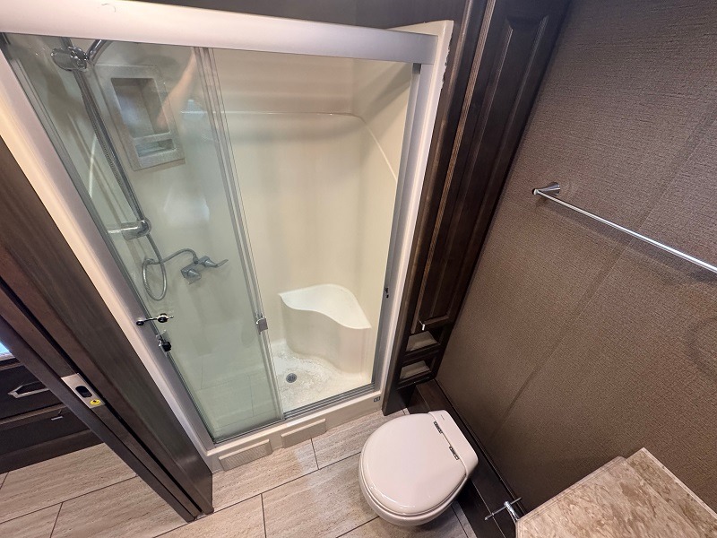 The rear bathroom provides lots of overhead cabinets, a corner shower, a toilet, a large corner vanity and sink as well as the option for under counter combo washer/dryer, and more!