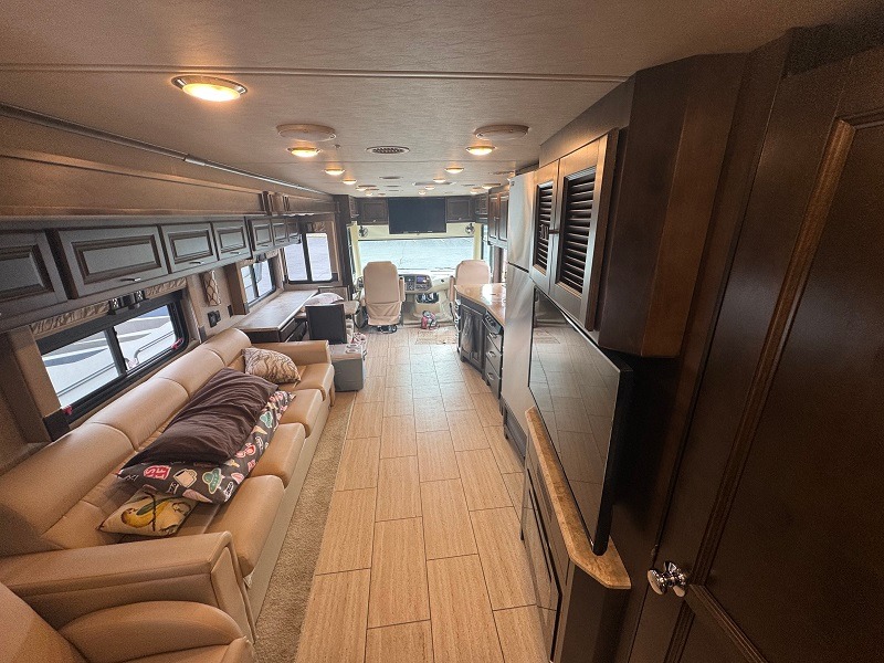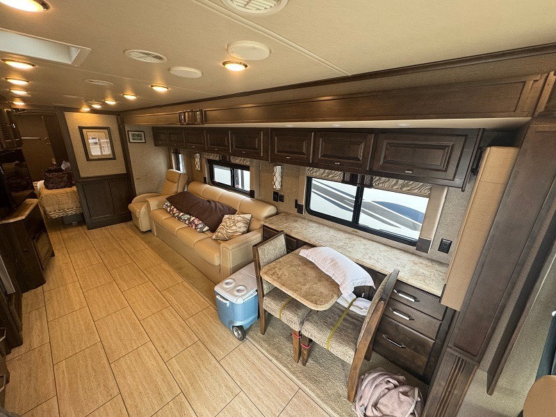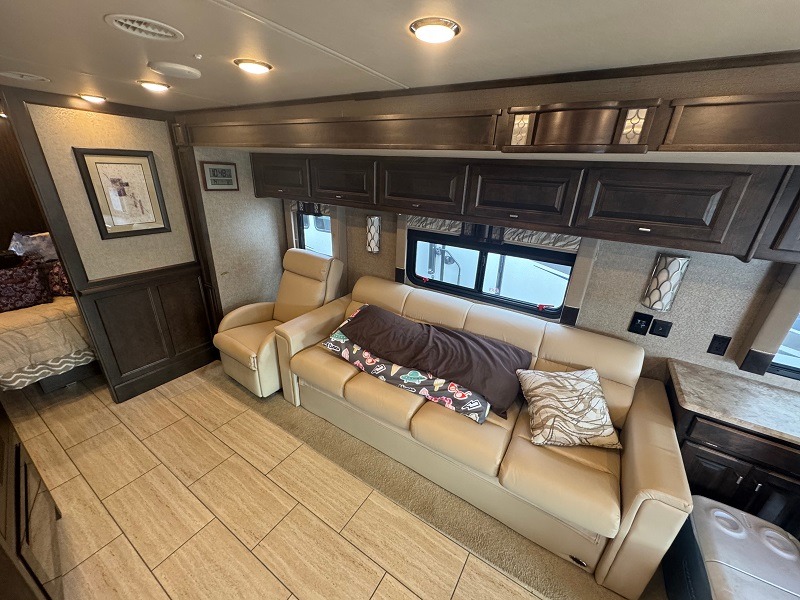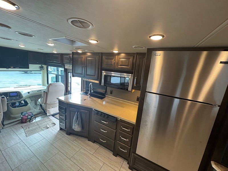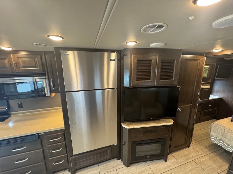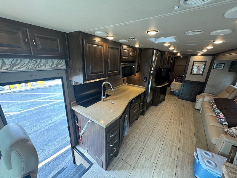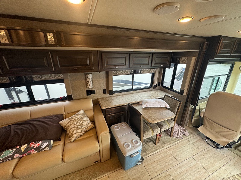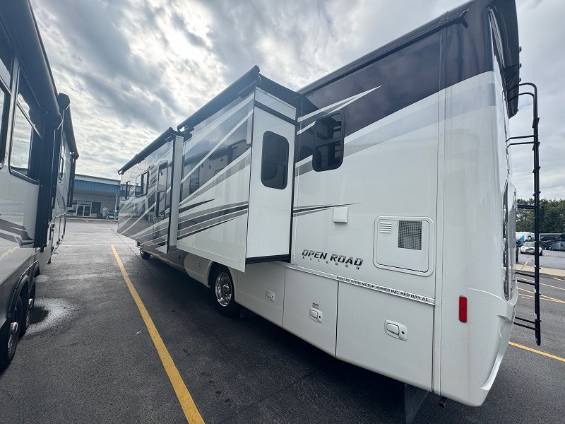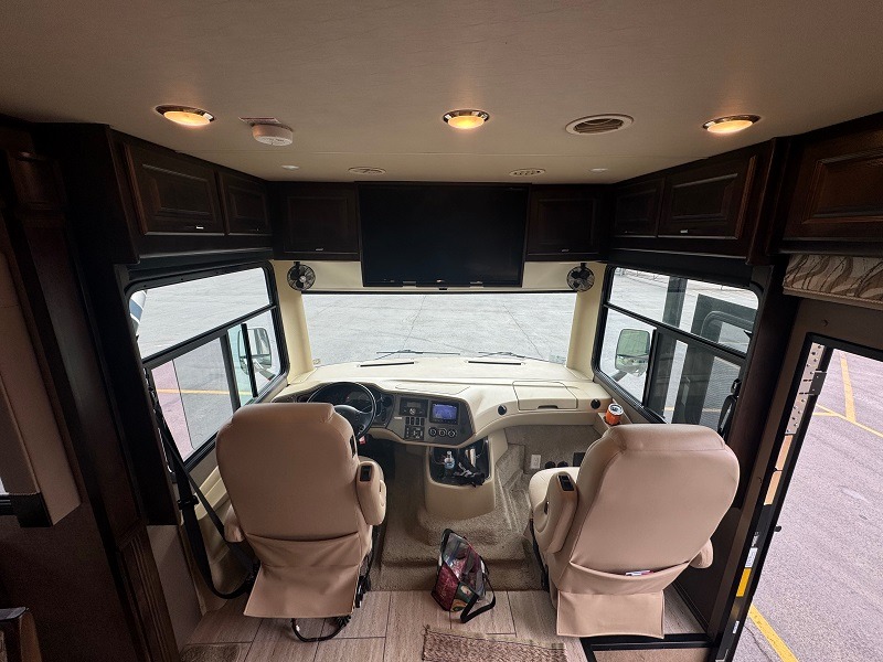 Step into this Open Road Allegro 36 LA class A motorhome to find two captain's chairs and overhead cabinets at each side in the front of the coach. There is also a TV above the cab for your viewing pleasure.