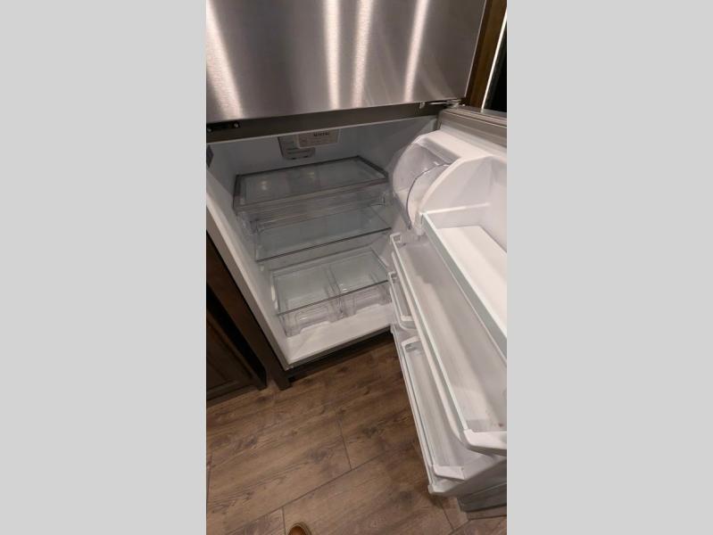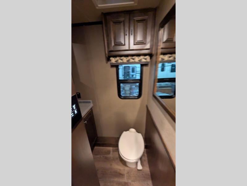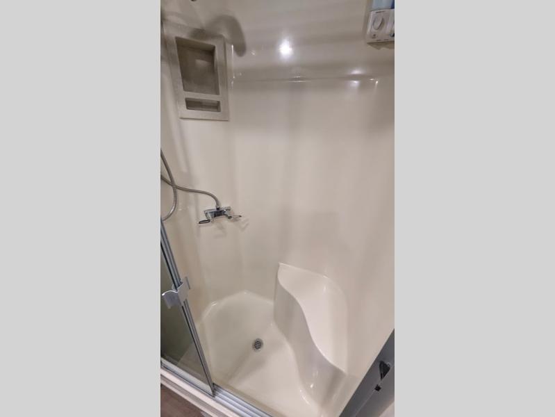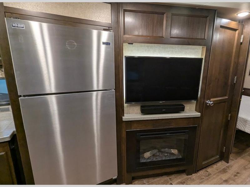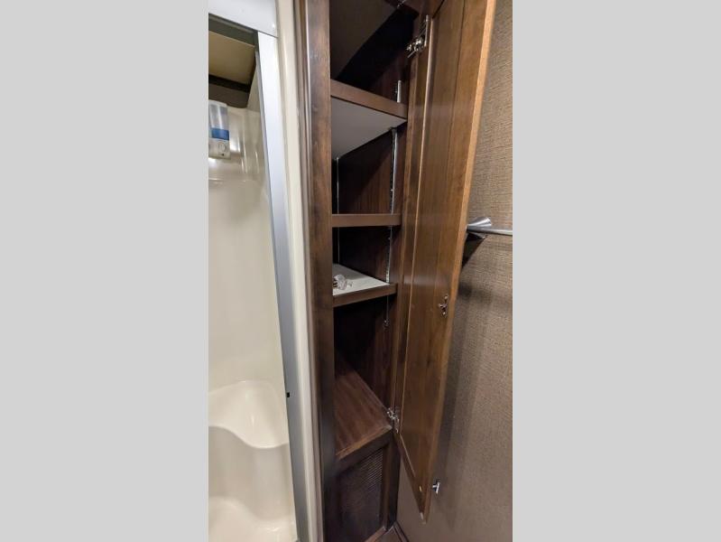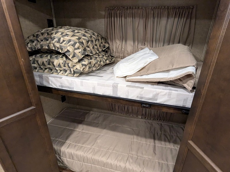 Continuing within the slide out there is a set of bunk beds for the kiddos or guests, plus a sofa bed, booth dinette, and overhead storage. You can also choose a table storage and a luxury lounge with removable dinette table. The full wall slide provides extra interior space from behind the driver's seat to the bedroom. A TV with optional fireplace is along the outside wall of the half bath.