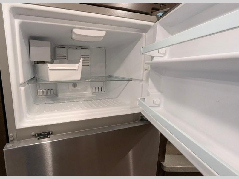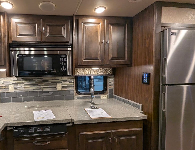 The kitchen along the curbside wall includes a refrigerator, double sink, three burner range with microwave above, and overhead cabinets for your dishes and things.