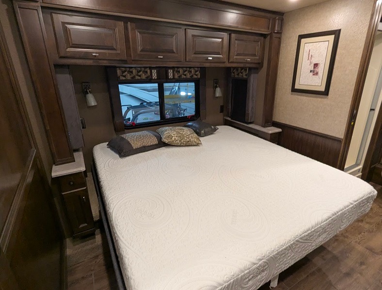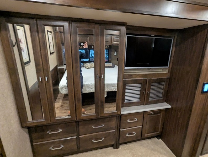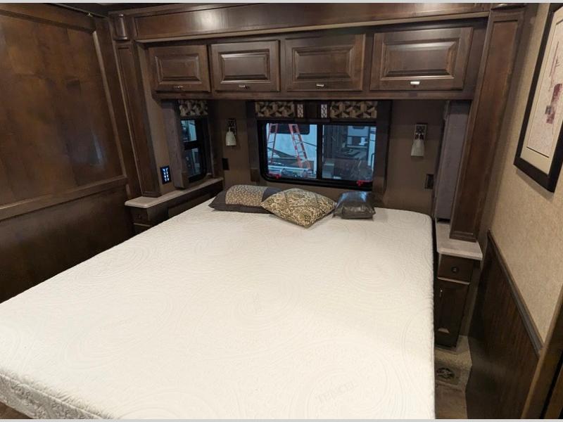 The bedroom features a king size bed slide out with nightstands and overhead cabinets along the curb side. A wardrobe with drawers below and a cabinet with a swivel TV above are on the opposite side of the bed inside the full wall slide out along the road side.