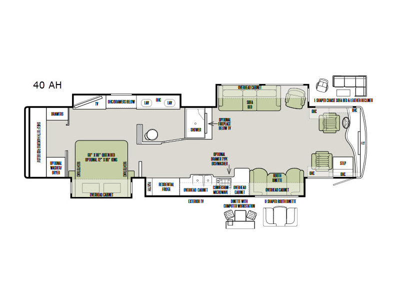 A large roadside slide has a chair and sofa bed, or you can choose an optional L-shaped chaise sofa bed and a leather recliner. Adjacent to the slide out along the interior wall there is a TV and an optional fireplace.