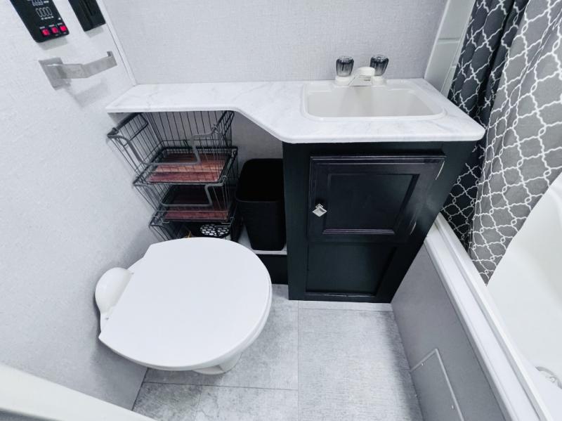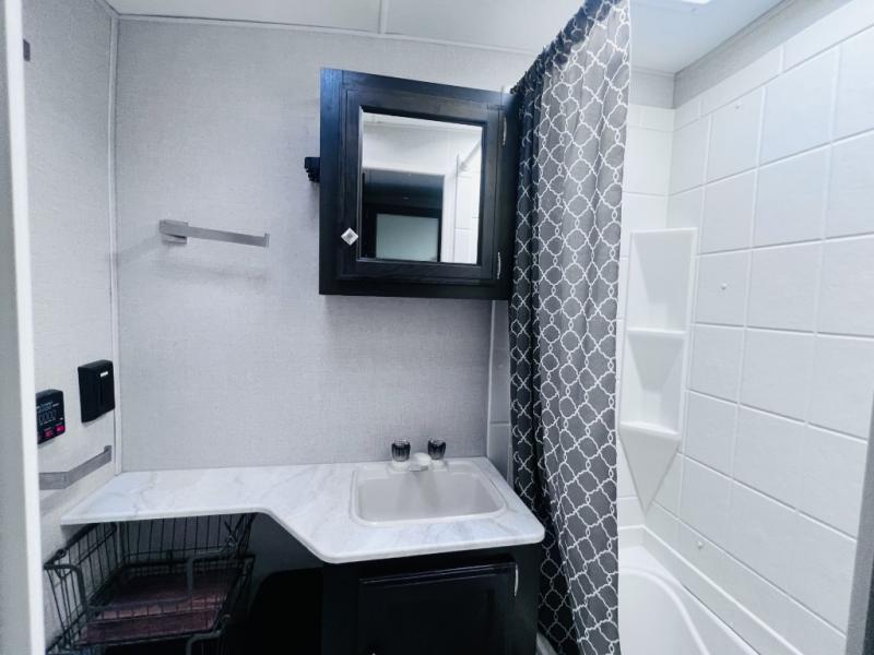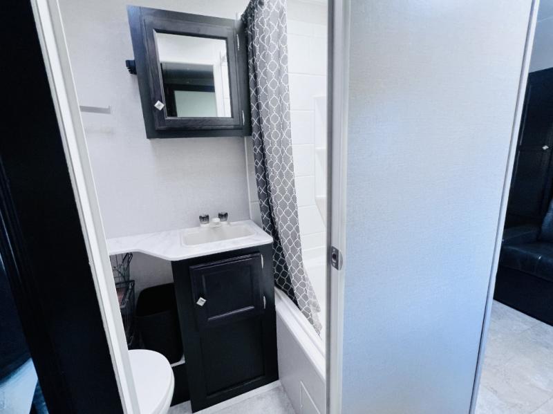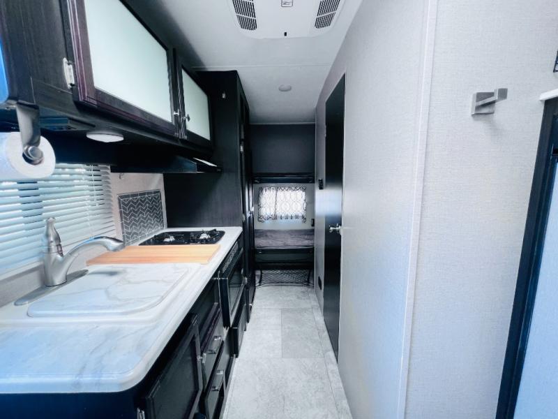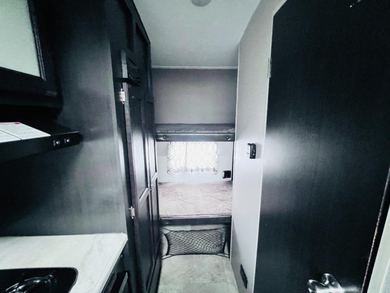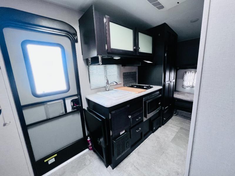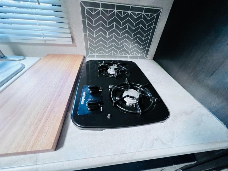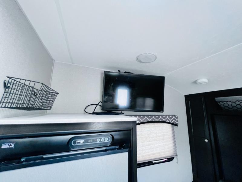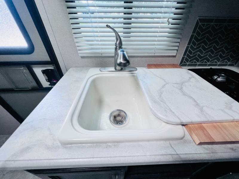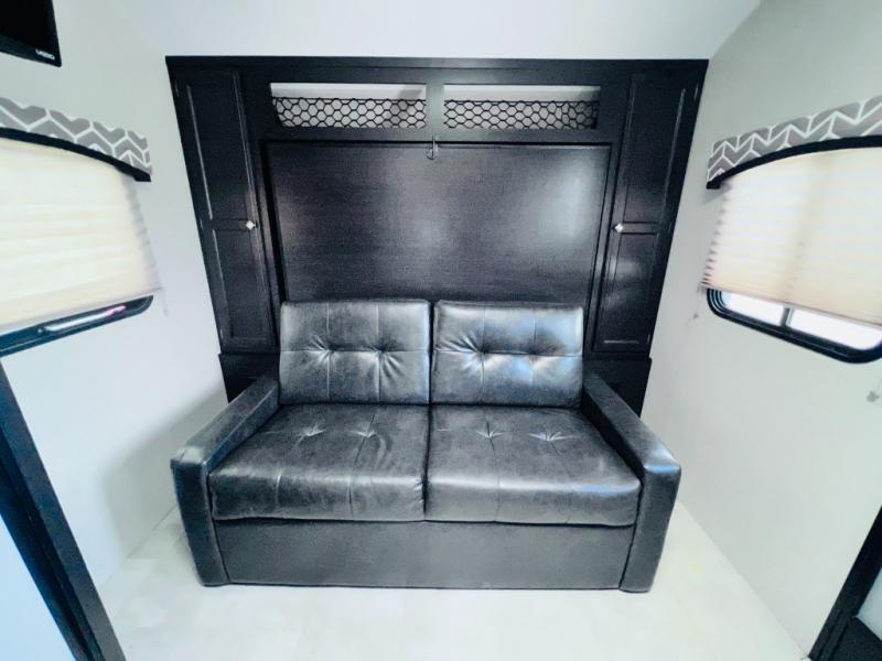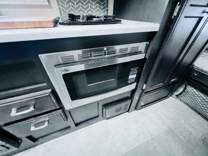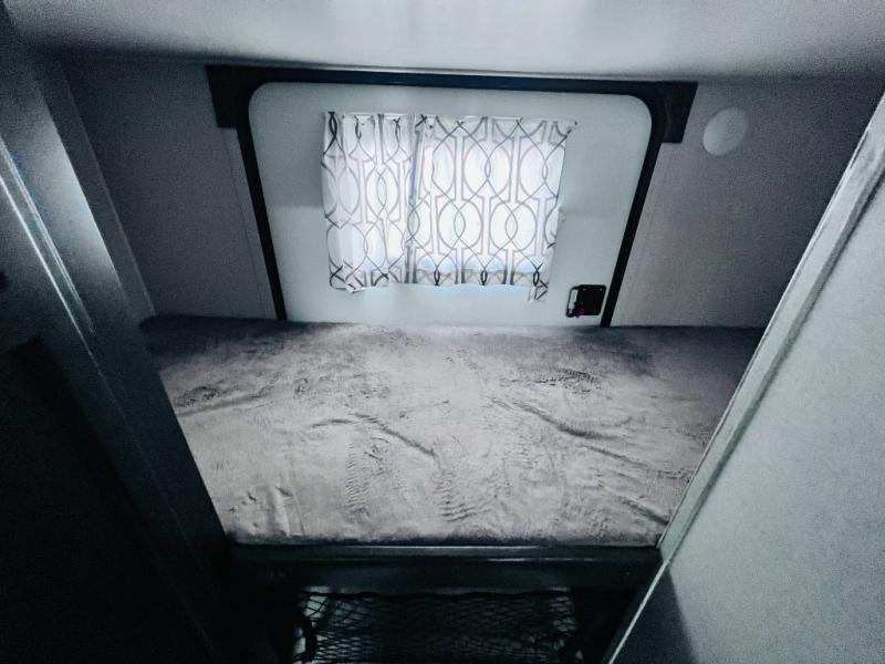 This Sonic Lite is the ideal travel trailer for a family of four for several reasons. Just imagine the kids choosing their favorite bunk, while you relax on the sofa after setting up. You can also dine at the sofa with a free standing table including two fold away chairs for the kids. At night, it's an easy set up to make the Murphy bed for yourself. And you don't have to worry about your bedding every morning, just push the bed back up into its space. The cook can make meals in the full kitchen which also includes a convection microwave. You will find storage inside for your clothing and things, and outside for your larger items either through the Pack-N-Play door in the rear, or pass-through compartment up front. Load up today!