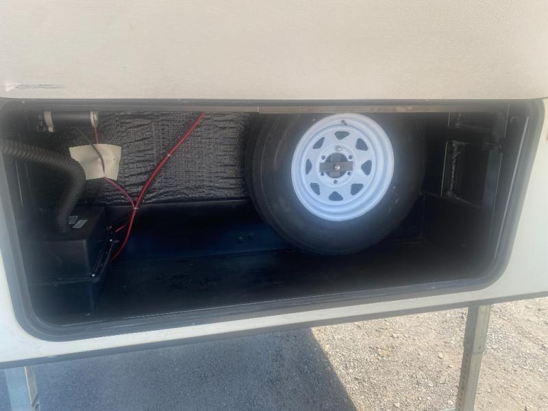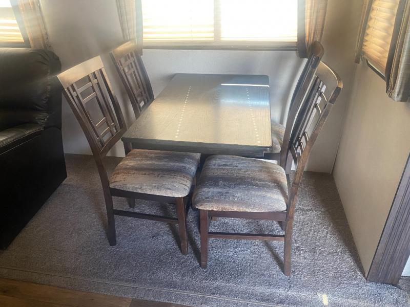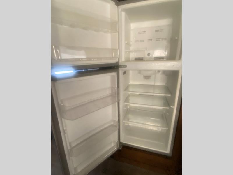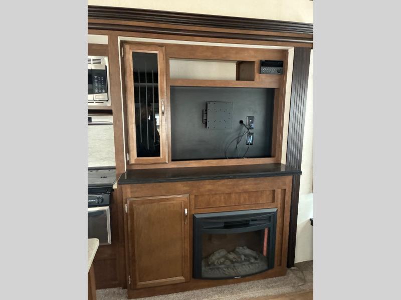 In the kitchen and living room there are dual opposing slides which help to open up the living space. The first slide has a refrigerator, counter space, overhead cabinets, three burner range, microwave, pantry for your canned goods, plus an entertainment center and fireplace. Along the rear wall you will find a tri-fold sofa, end tables, and more overhead cabinets.