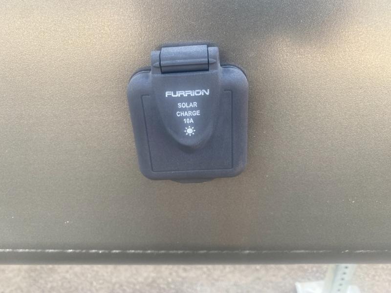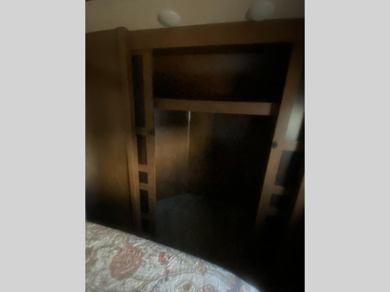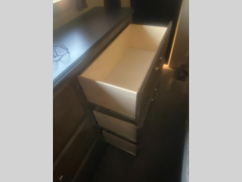 Retreat to the front bedroom and enjoy a custom king bed with shelf which is on a slide. Across from the bed there is ample storage with the dresser, and along the front of the room find a wardrobe with shelf.