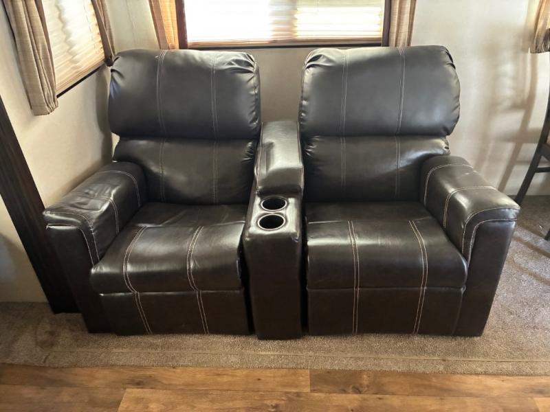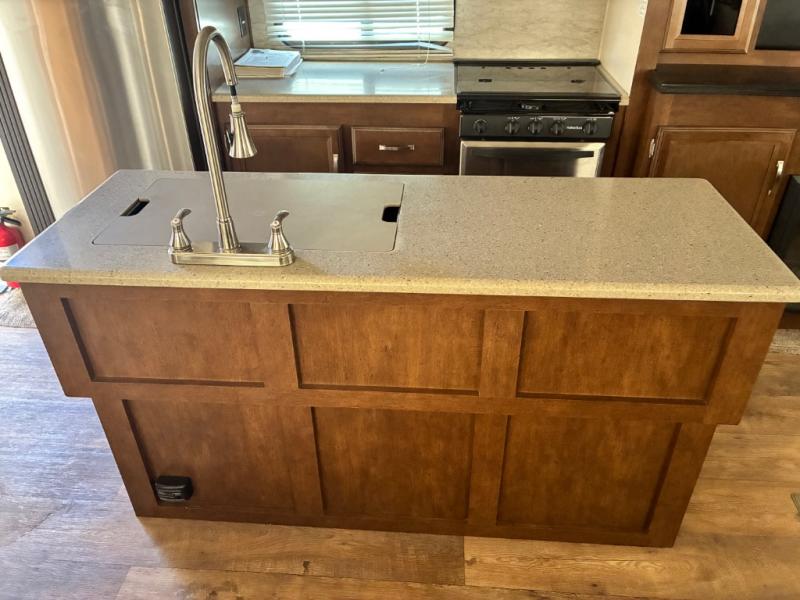 The second slide in this area has theater seating with cup holders, and a dinette. Adjacent to the slide you will find a second pantry and a corner cabinet. In the middle of the kitchen clean up is a breeze with the island and sink.